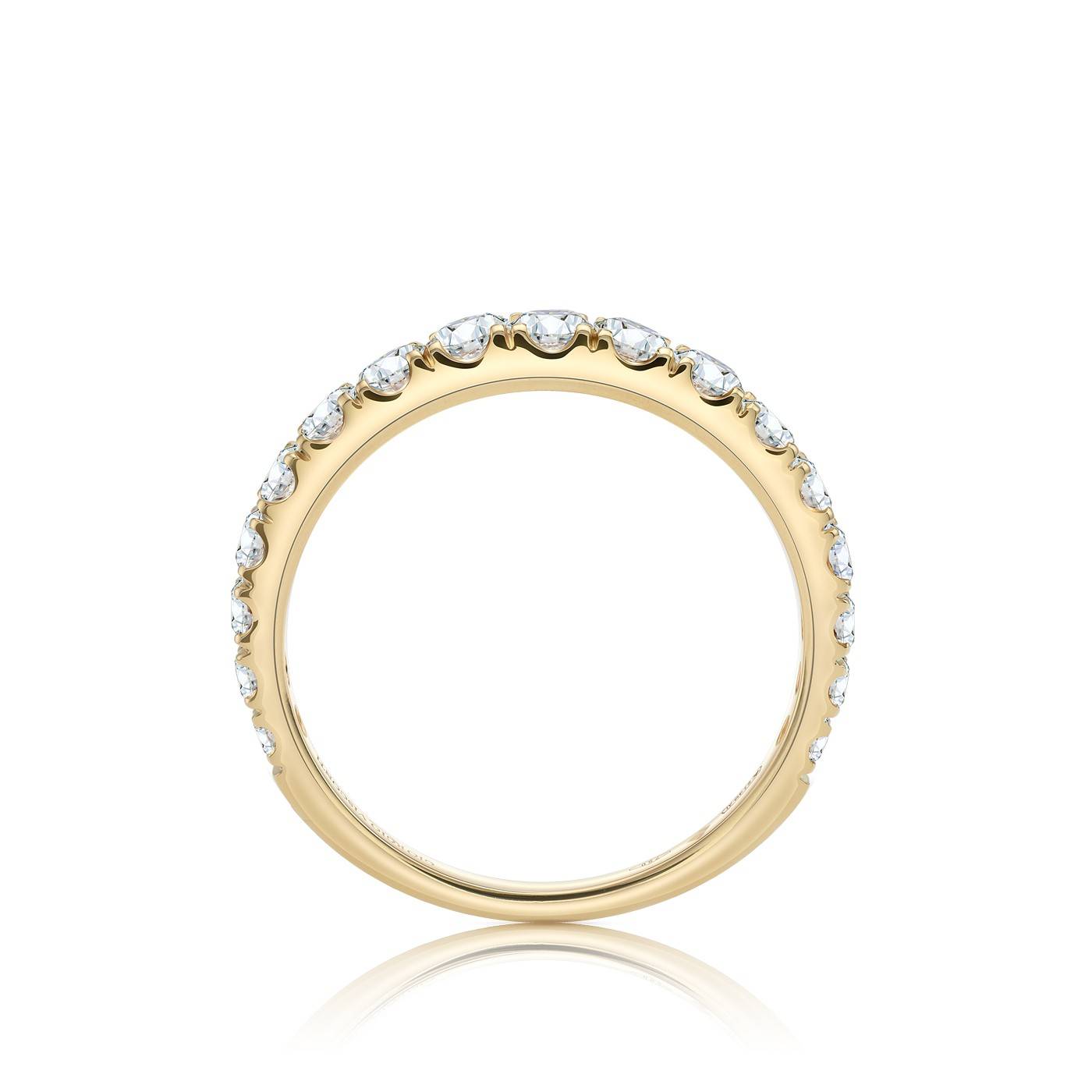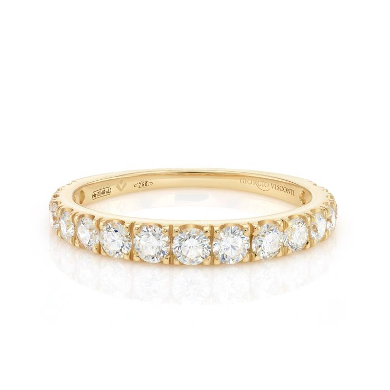 Bella alianza atemporal en oro amarillo de 18K con 17 Brillantes de suave disminución, engastados con cuatro garras sutiles. Una joya para llevar a diario. La calidad de los diamantes es FG VS. Fabricado para Jorge Juan Joyeros. REFERENCIA; SV 23