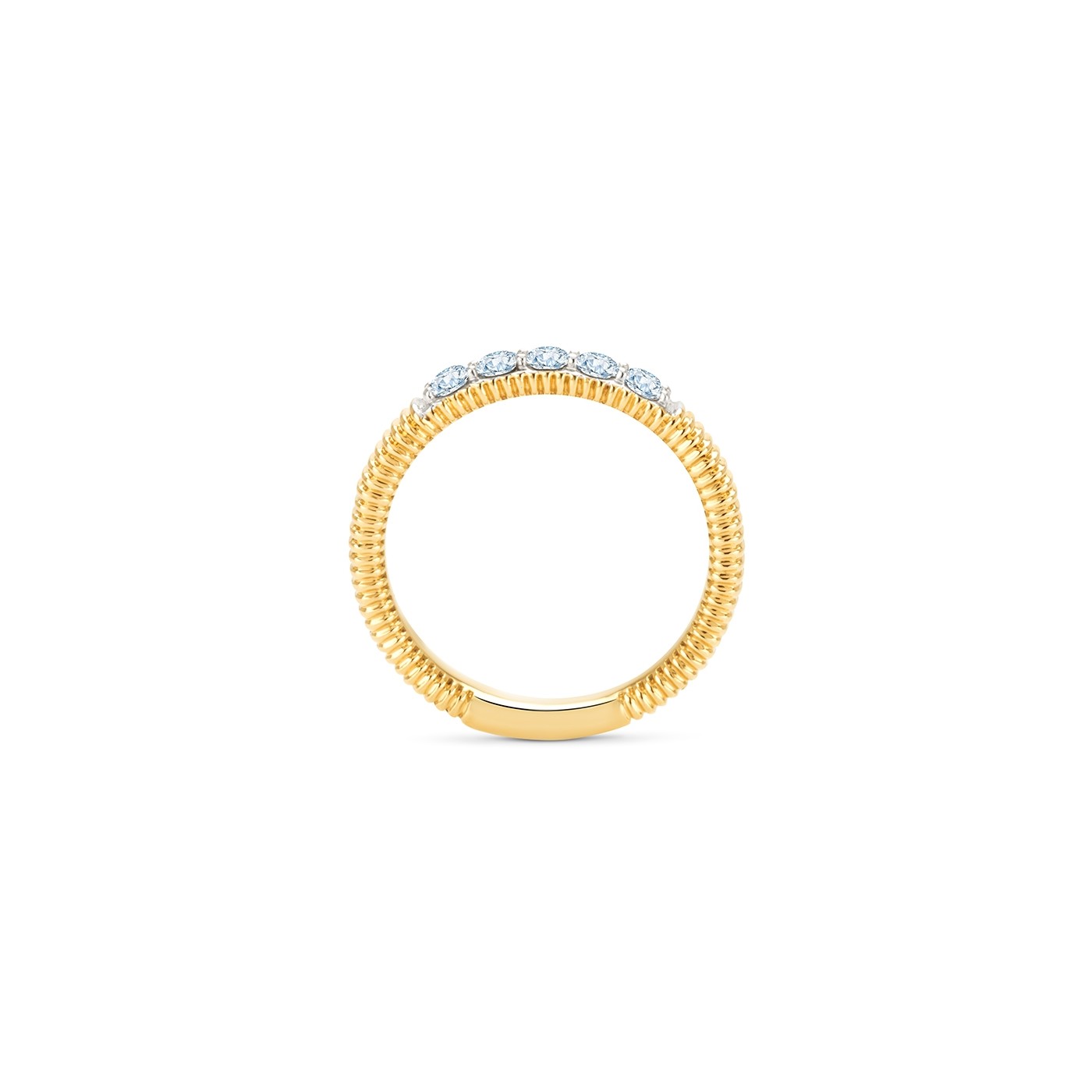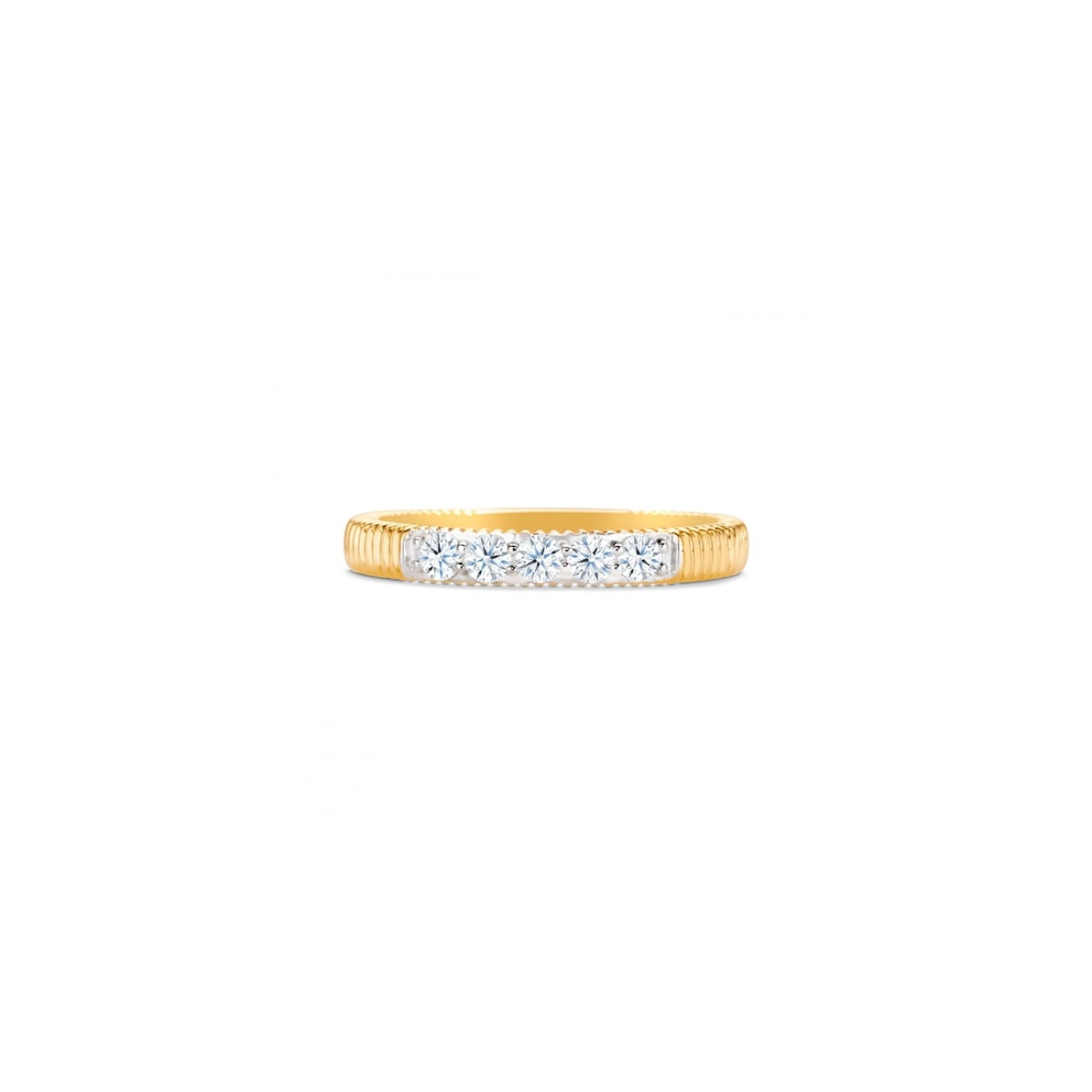 Alianza Cintillo Belle diamantes en oro de 18k. Alianza con cinco brillantes realzados por un labrado galloneado que aporta distinción y originalidad al conjunto. Esta Alianza con diamantes es perfecta para regalar en cualquier ocasión, bien sea como anillo de compromiso en oro y diamante o para un aniversario. La alianza "Belle Cintillo ST-8" combina elegancia y originalidad. Esta pieza, diseñada en oro blanco de 18 quilates, presenta un conjunto de cinco brillantes realzados por un detallado labrado galloneado, lo que aporta una distinción única. Además, presenta un engaste especial que no solo asegura los diamantes, sino que también los resalta mediante un sofisticado labrado que captura y refleja la luz de manera excepcional.