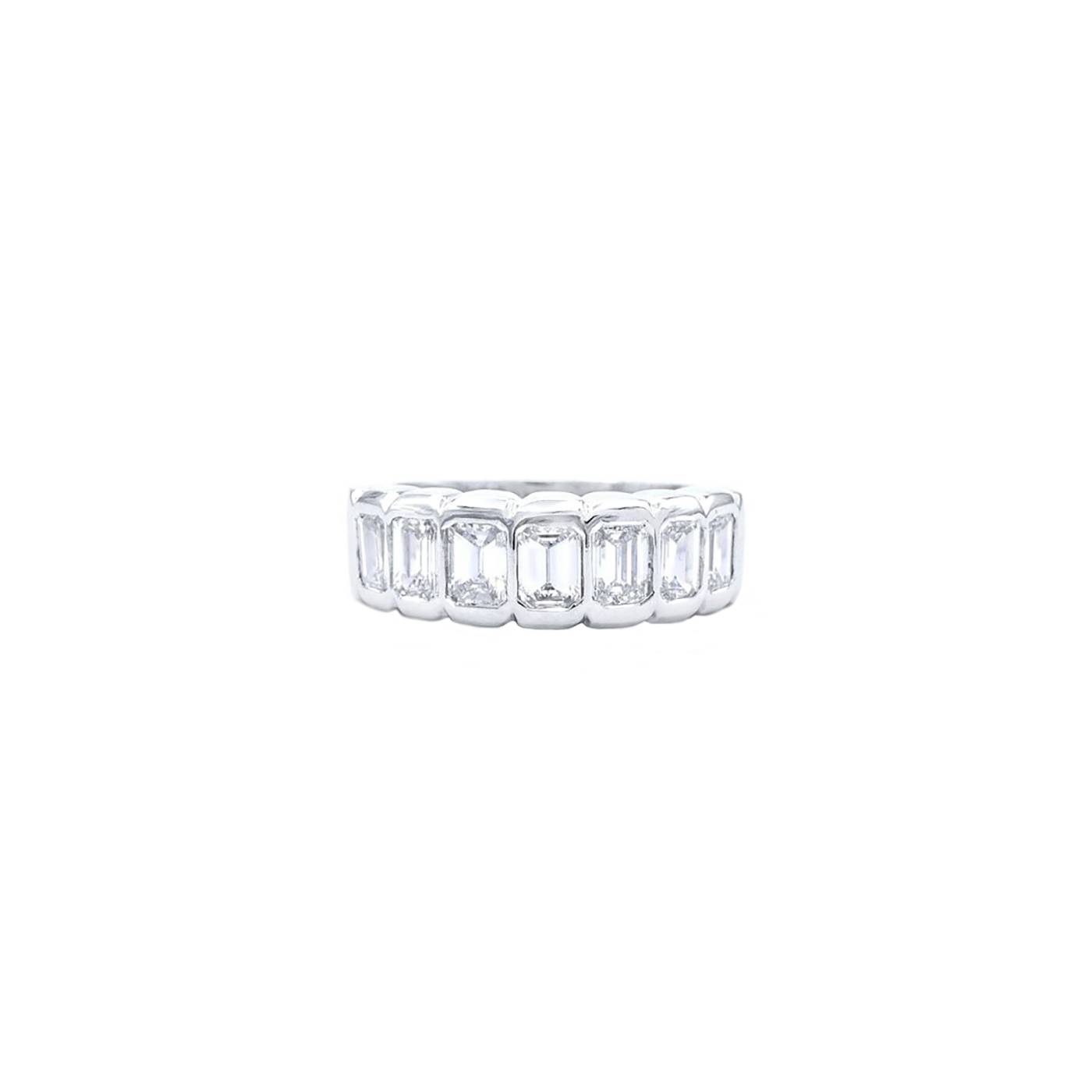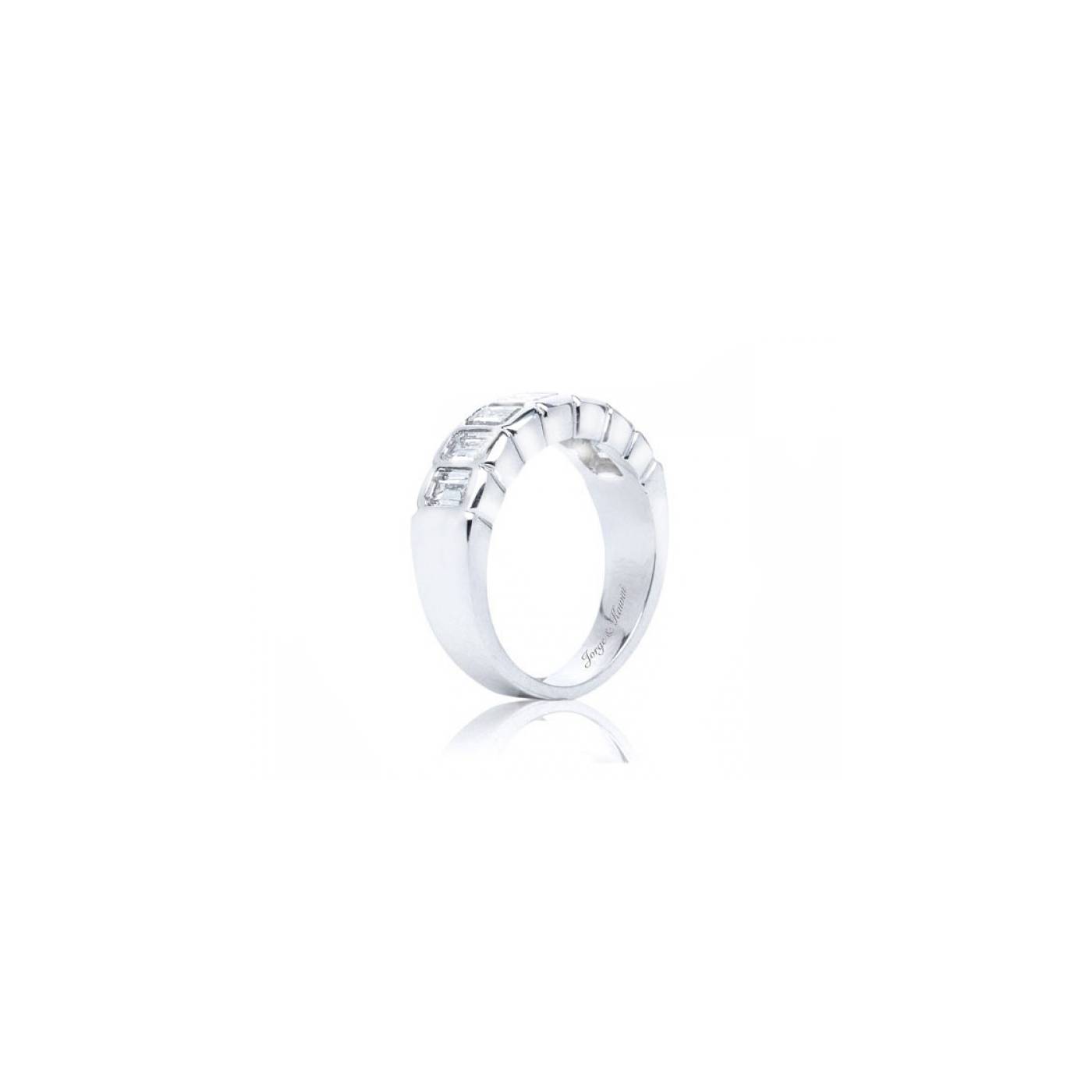 Alianza exclusiva con 7 diamantes talla Esmeralda. Cada diamante va engastado en un chatón de forma rectangular. Alianza original tanto por la forma del diamante como por el diseño de la joya. Alianza moderna para aniversario.