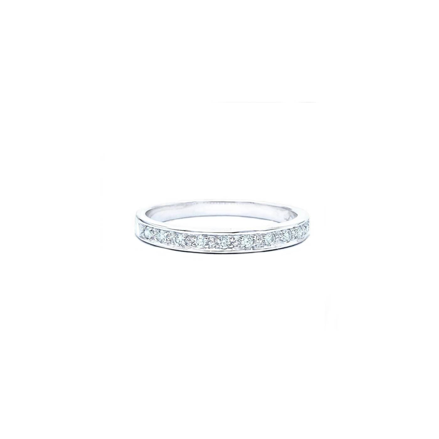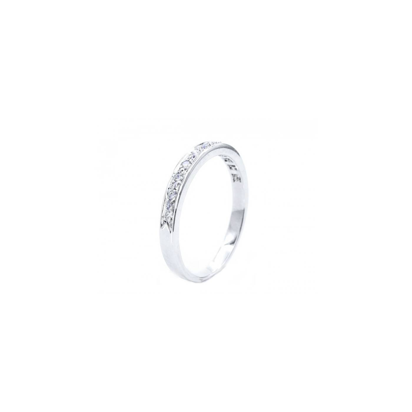 Alianza de matrimonio con brillantes en Oro Blanco 18 k. Sencilla alianza ideal para acompañar al Solitario de compromiso o sola. Elegante y delicada. Lleva 11 brillantes de 1,3 mm.