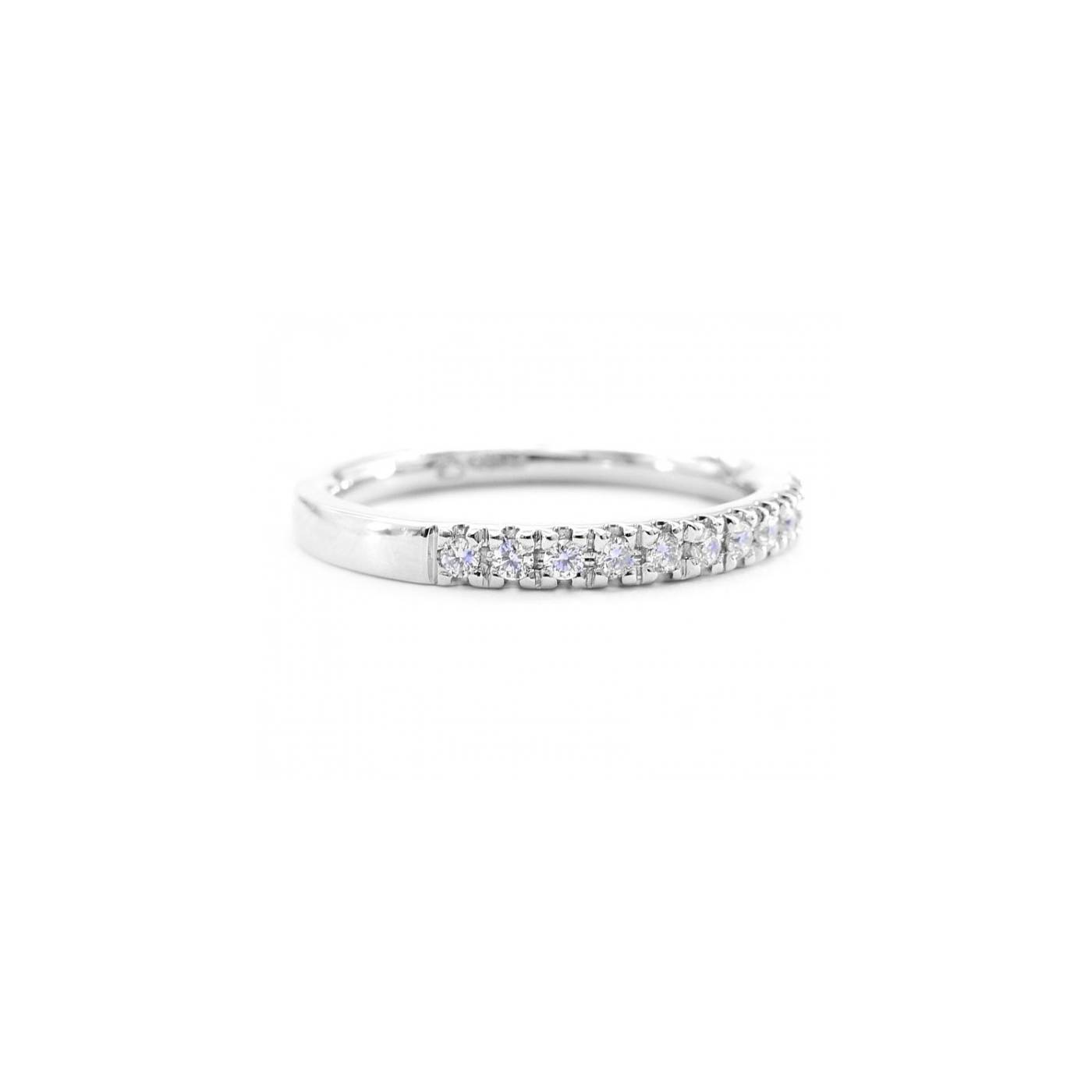 Alianza Oro Blanco Brillantes CHICAGO de 18k engastados con cuatro garras bajas. Alianza muy cómoda de llevar para pedida de mano o como alianza de matrimonio. Lleva un total de 18 brillantes.