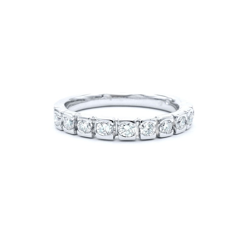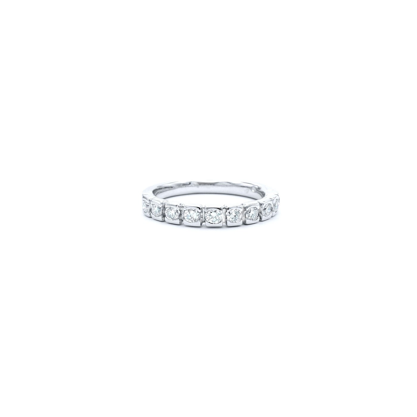 Alianza de brillantes. Alianza de 10 brillantes engastados en un semi chatón cuadrado. De perfil se ven las separaciones formando un dibujo original. Alianza especial y cómoda para el día a día. Perfecta como anillo de pedida de mano o como regalo de aniversario.