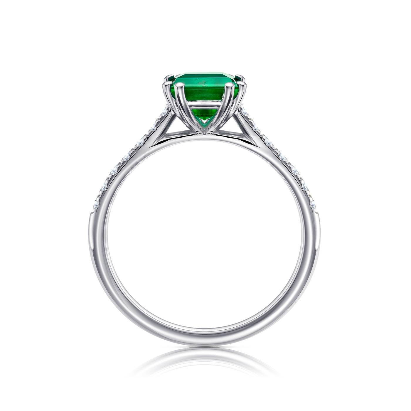 Anillo con brillantes en el brazo en oro blanco 18K y esmeralda colombiana cuadrada