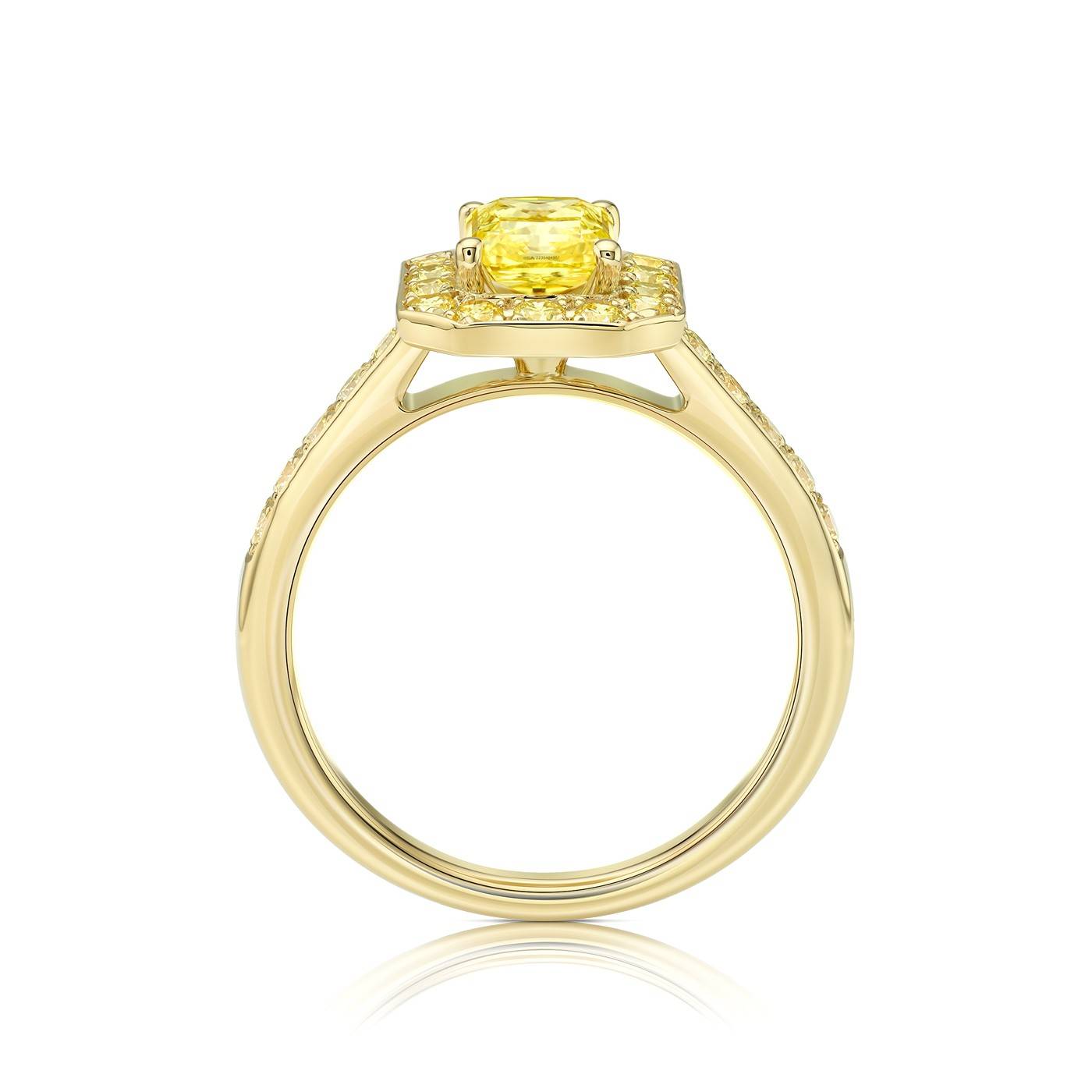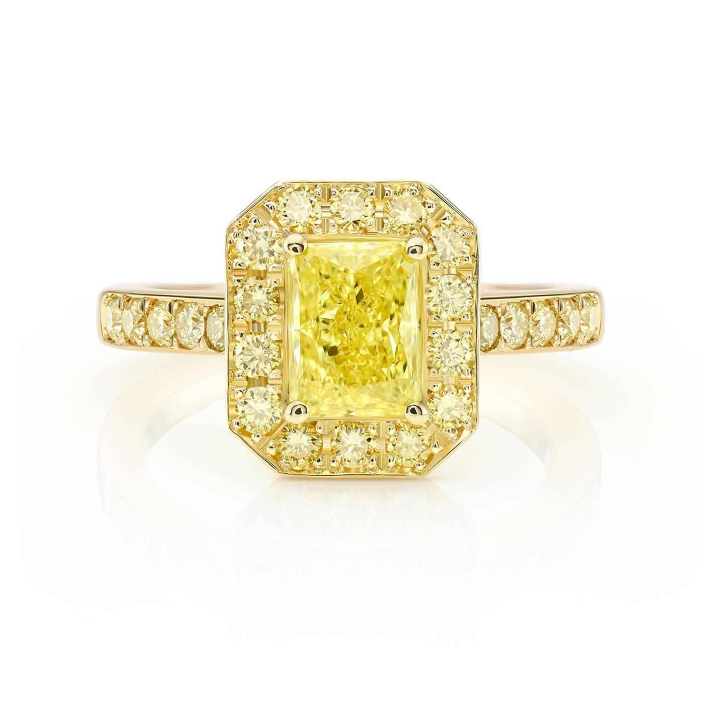 Anillo Diamantes Amarillos naturales en Oro 18k con Diamante central corte Radiant Cut Fancy Intense Yellow, certificado por la GIA acompañado por brillantes fancy yellow. Una joya única realizada por nuestro taller de joyería de Madrid, bajo la supervisión de nuestro diseñador.
