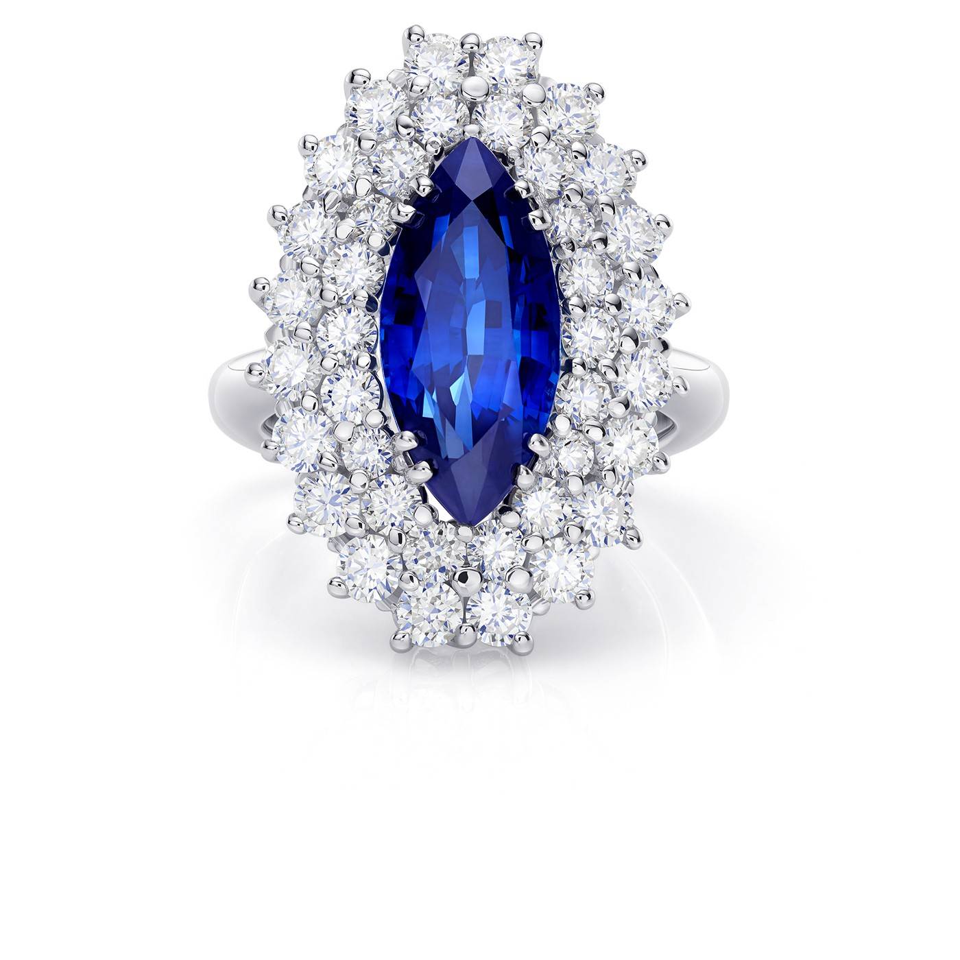Anillo con gema preciosa corte Marquise con diamantes y un zafiro de bello color