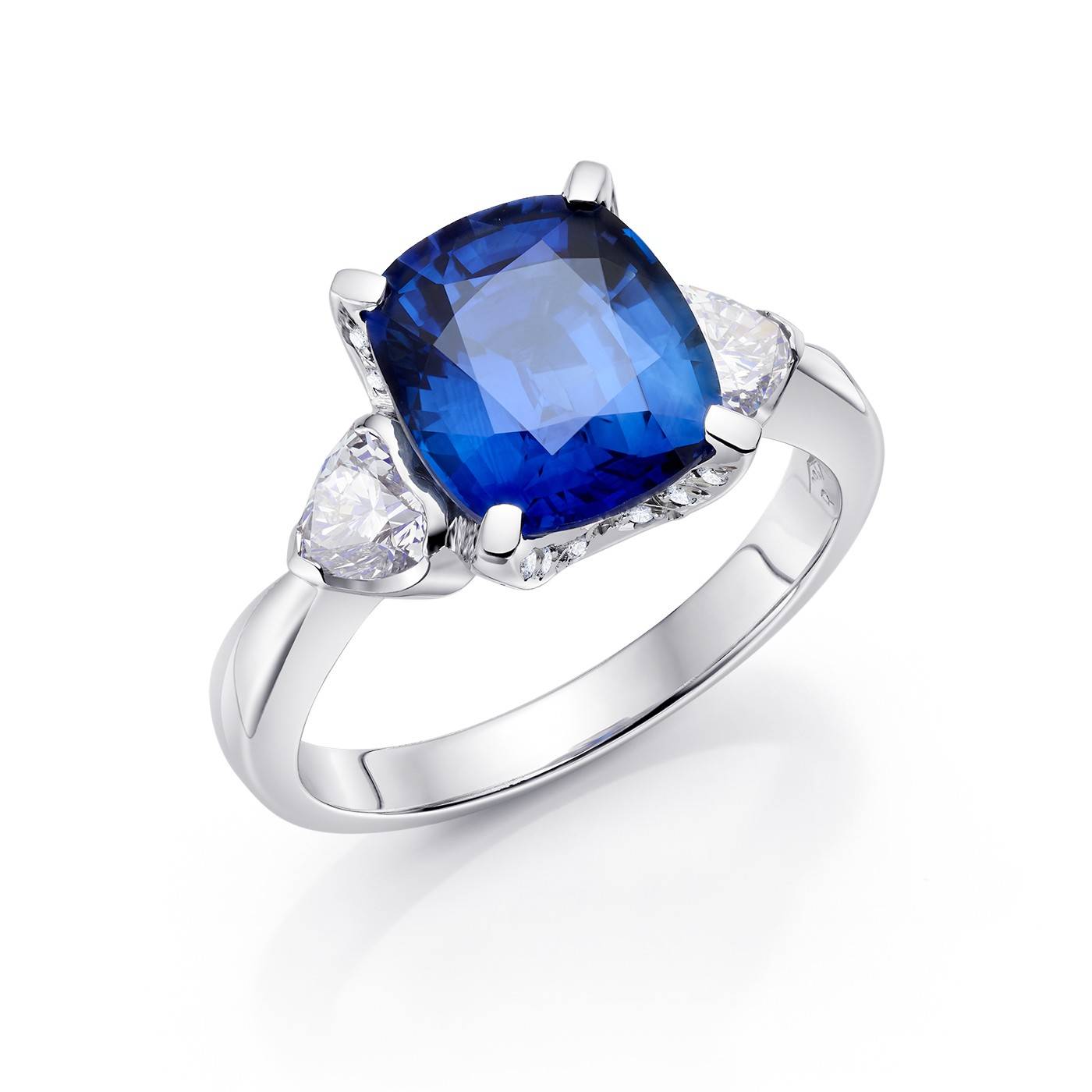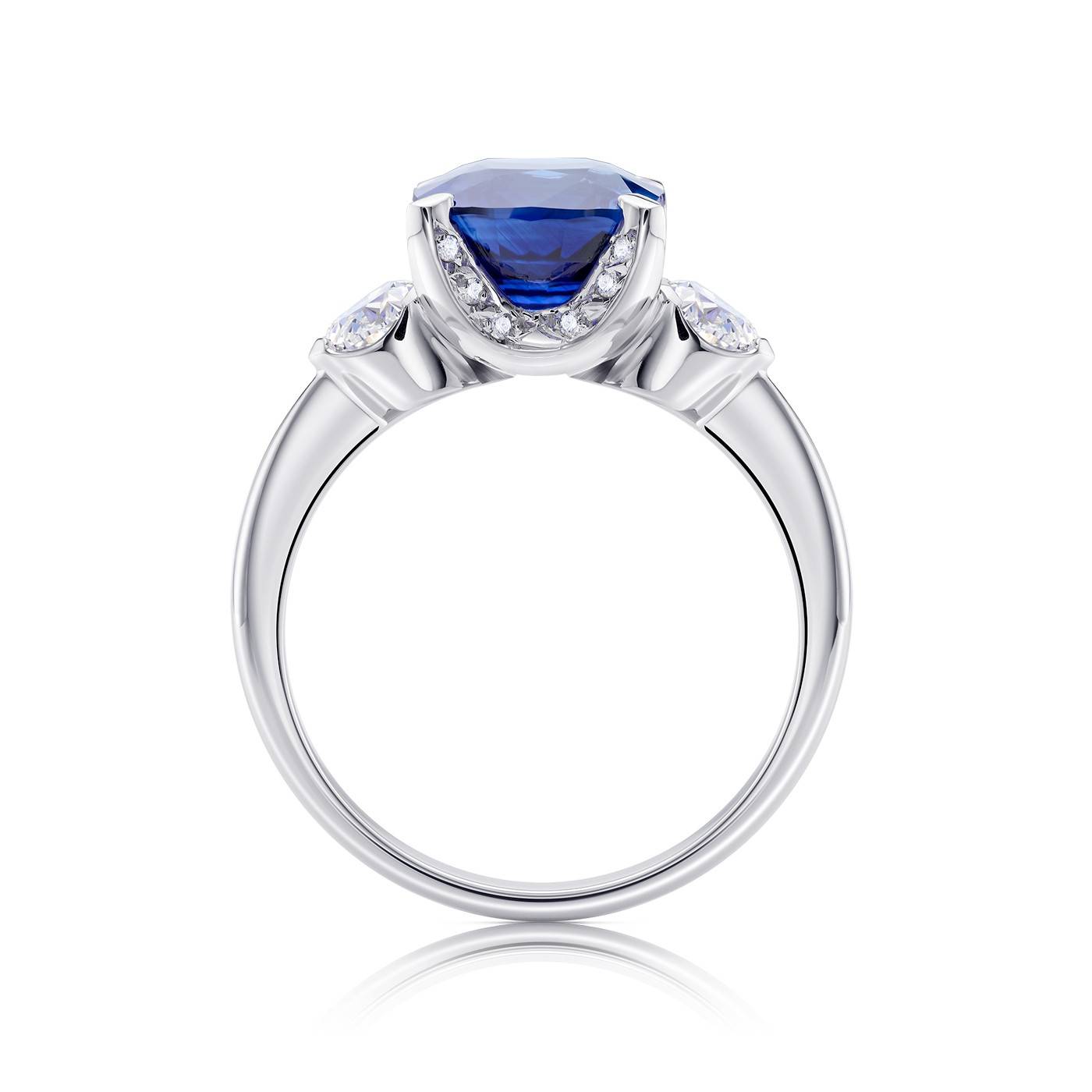 Anillo con zafiro azul Royal en oro blanco y diamantes en orla rodeando la gema central, anillo clásico de alta joyería