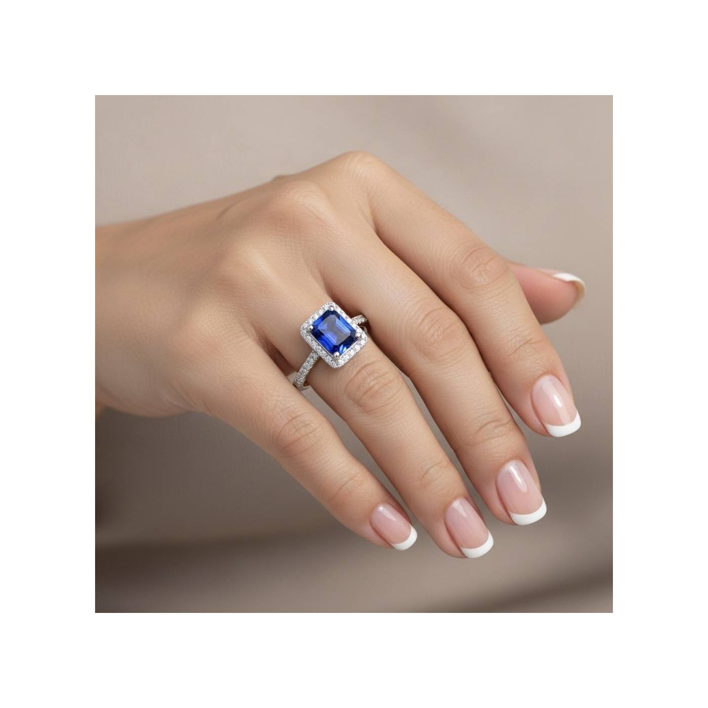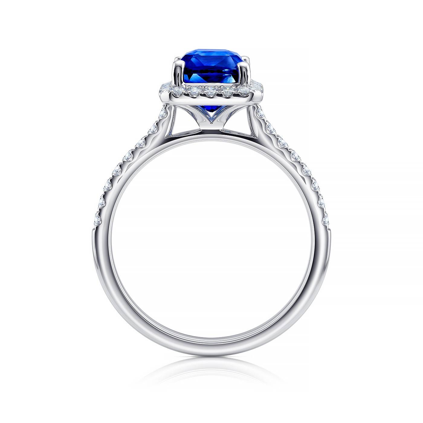 Anillo con zafiro azul Royal en oro blanco y diamantes en orla rodeando la gema central, anillo clásico de alta joyería