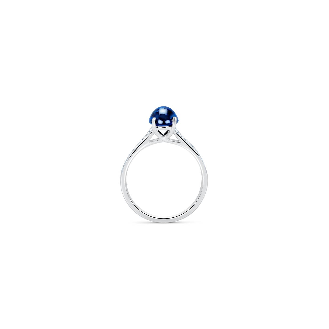 Anillo de oro blanco 18K con zafiro azul de talla cabuchón y diamantes. Aquí podras Ver anillos con zafiros de diseño creativo con diamantes de talla baguette y talla brillante. Una joya especial para personas que buscan una joya diferente. Esta joya la realizamos con gemas preciosas azules de forma oval de diferentes pesos y medidas. Nuestras gemas se caracterizan por su color azul intenso aterciopelado ideales para la pedida de mano, descubre nuestra colección de anillos de compromiso en Madrid.