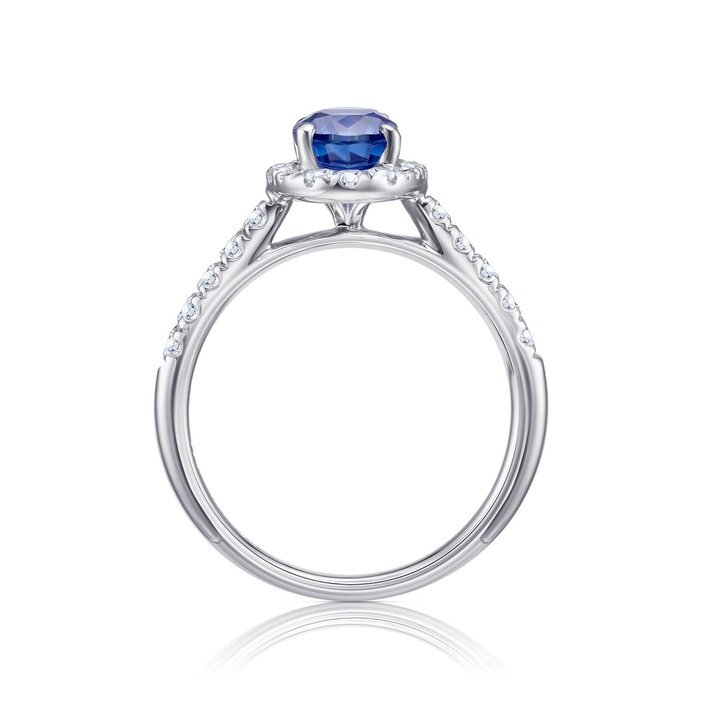 anillo de oro blanco con zafiro central y diamantes en el brazo y en la orla rodeando el zafiro