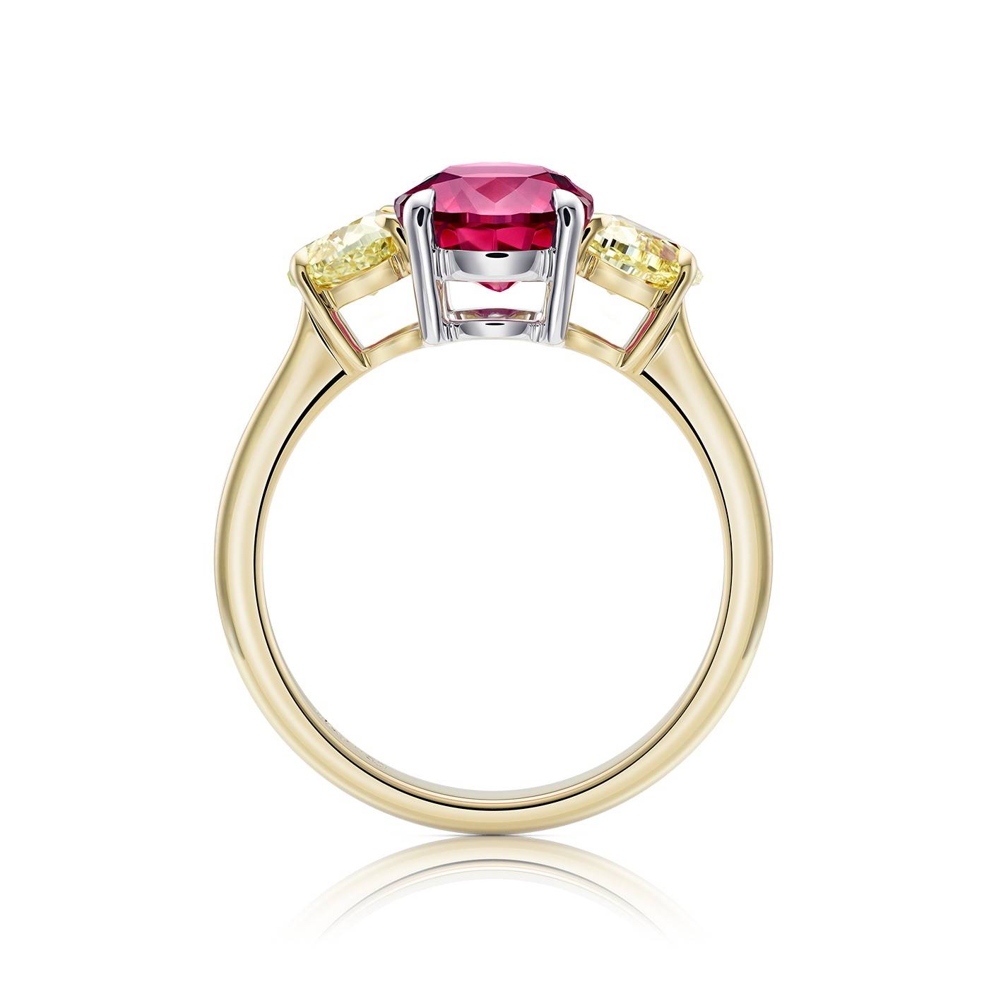 Pieza en Alta joyería realizada con metales nobles y piedras preciosas de color rojo intenso de altísima calidad, una joya que comparte oro de 18K de Ley con piedras de color rojo y amarillo que dan un valor especial al conjunto. Esta pieza está disponible en nuestras joyerías de Madrid así como personalizadas en nuestro taller de joyería. Si deseas encontrar anillos con rubí, estás en el sitio perfecto, disponemos de una excelente selección de rubíes de altísima calidad en nuestras joyerías.