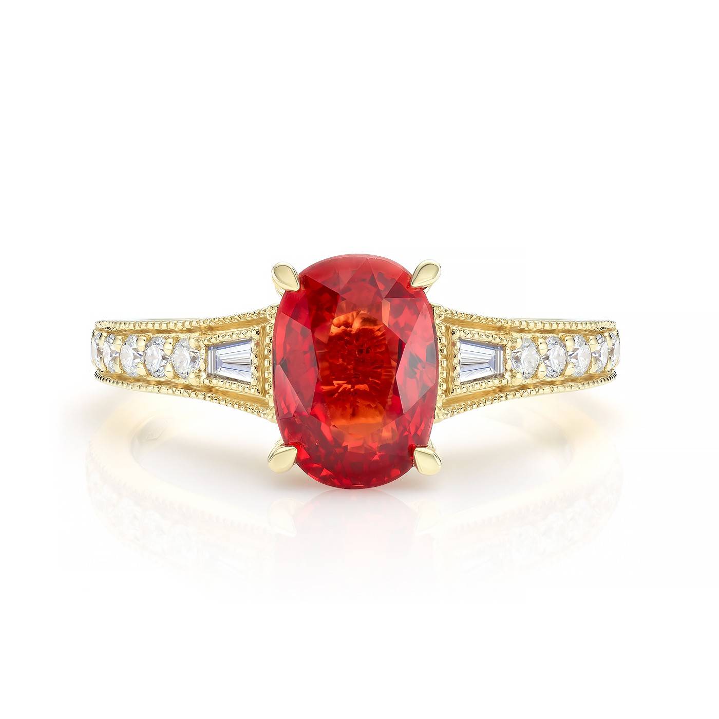Anillo de oro rosa con zafiro naranja y diamantes a los lados con y un exquisito color azul diseñado y realizado en alta joyería. Si quieres puedes ver anillos con zafiros visiarnos en nuestras joyerías de Madrid o verlos en nuestra web. El diseño de esta elegante montura recuerda al estilo Vintage por la filigrana que perfila el brazo. Los zafiros de Jorge Juan Joyeros son adquiridos en origen por nuestro equipo de gemólogos. Cada pieza es única por su intensidad de color y tonalidad. Los zafiros naranjas son especiales por su rareza,. Jorge Juan Joyeros.