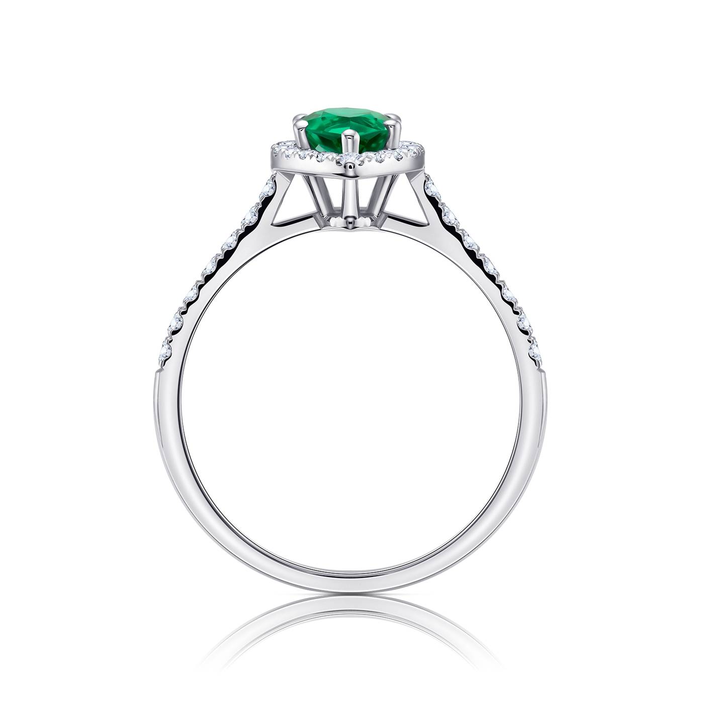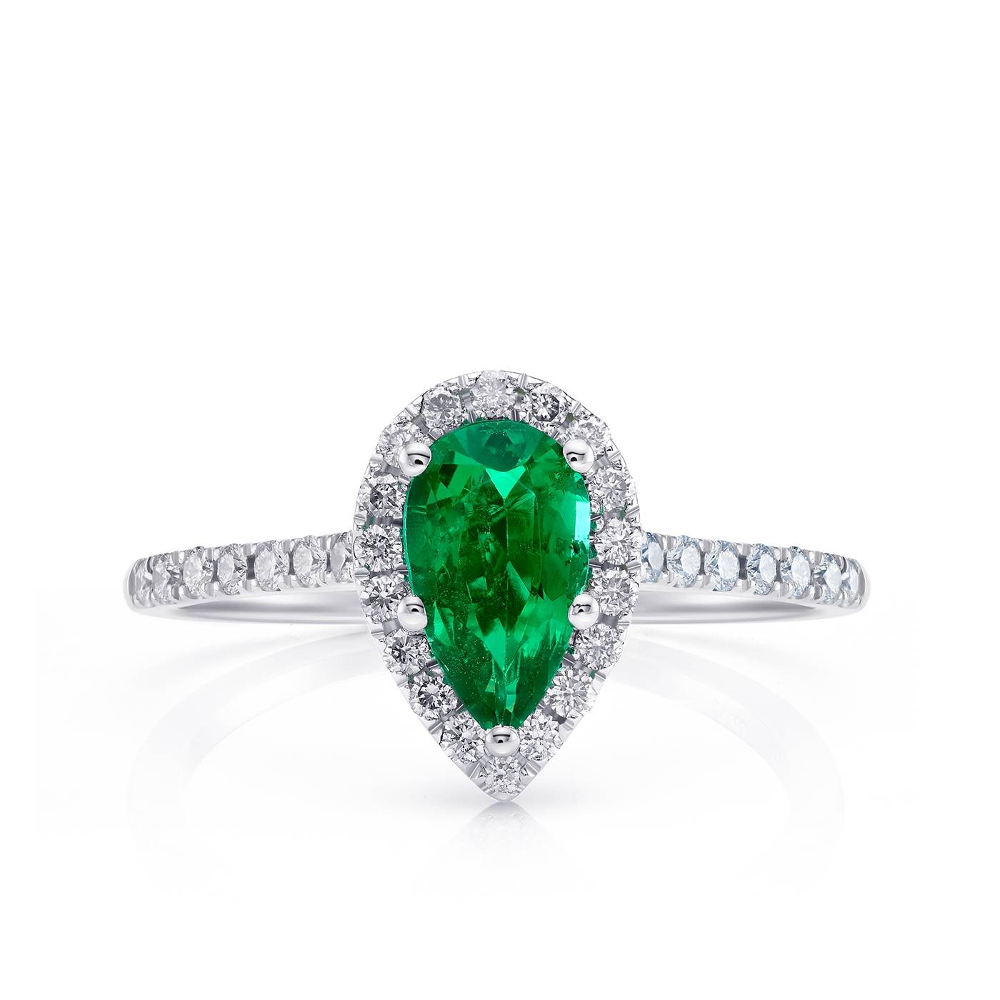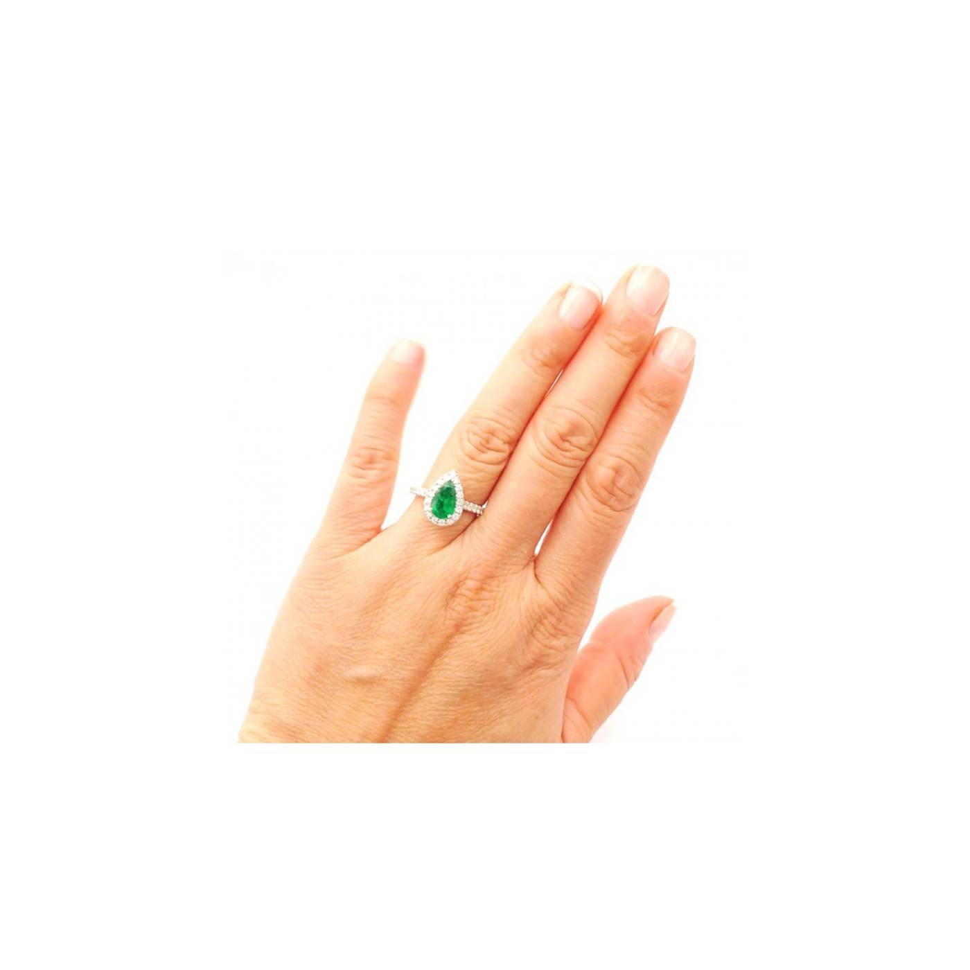 Anillo en forma de Pera con una esmeralda y diamantes alrededor en oro blanco de 18K