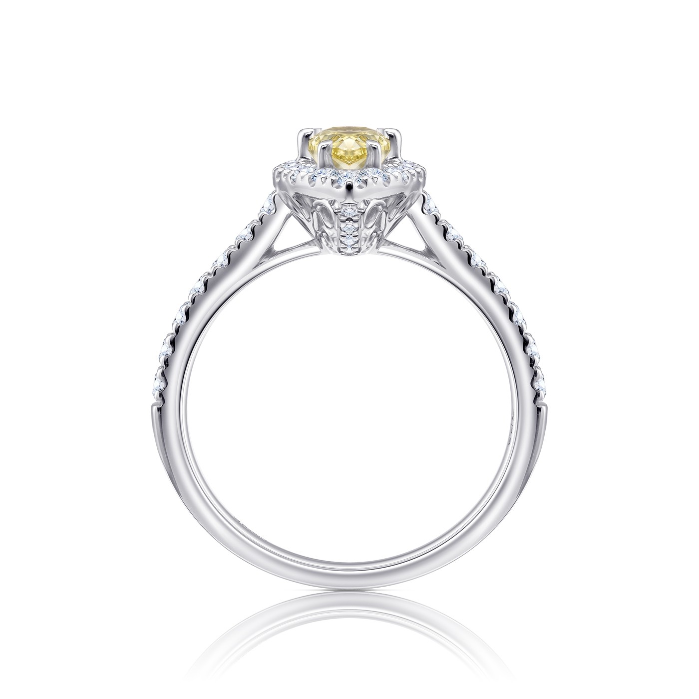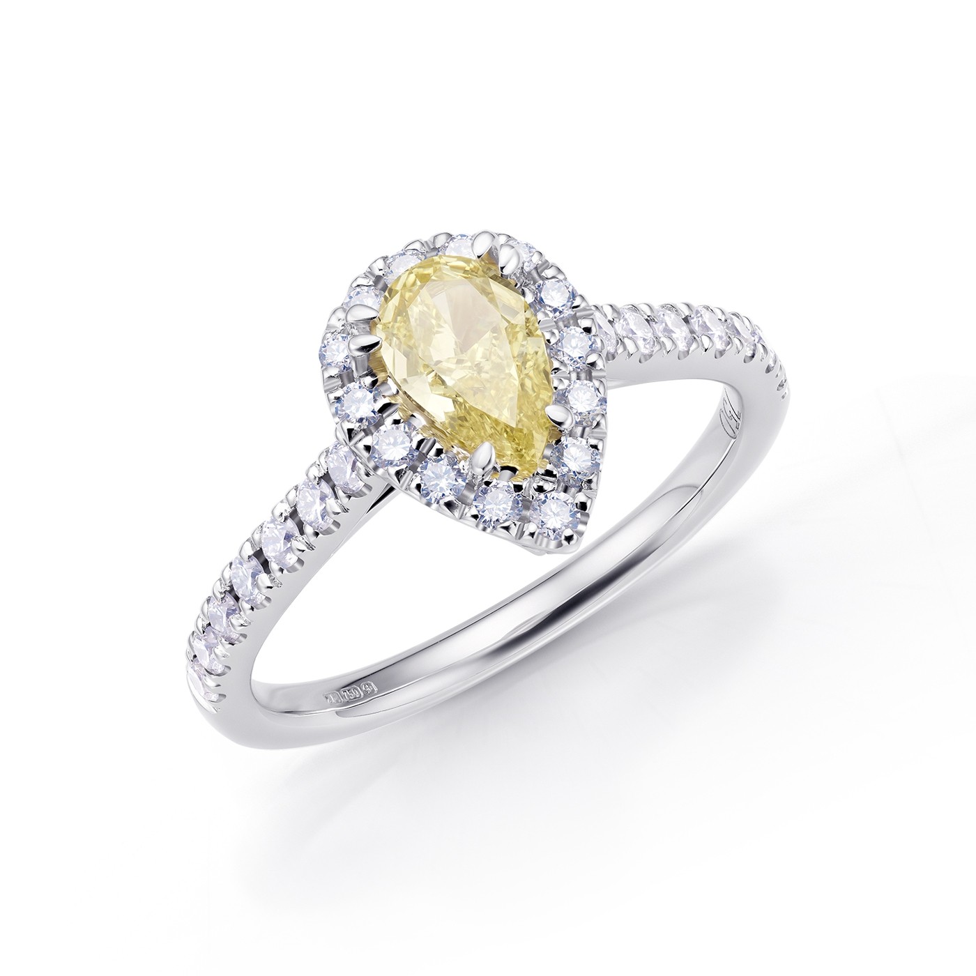Anillo "Fancy Pear shape" en oro con diamante natural Fancy Yellow - SR 151, con certificado gemológico como todas nuestras joyas. La orla de brillantes y los brillantes del brazo tienen un peso total de 0.41 ct que acompañan a esta piedra exclusiva realzando su belleza. Para Novias originales que buscan la exclusividad. Visita nuestra colección de anillos de compromiso oro blanco ;en nuestras tiendas de Madrid. REF: SR 151