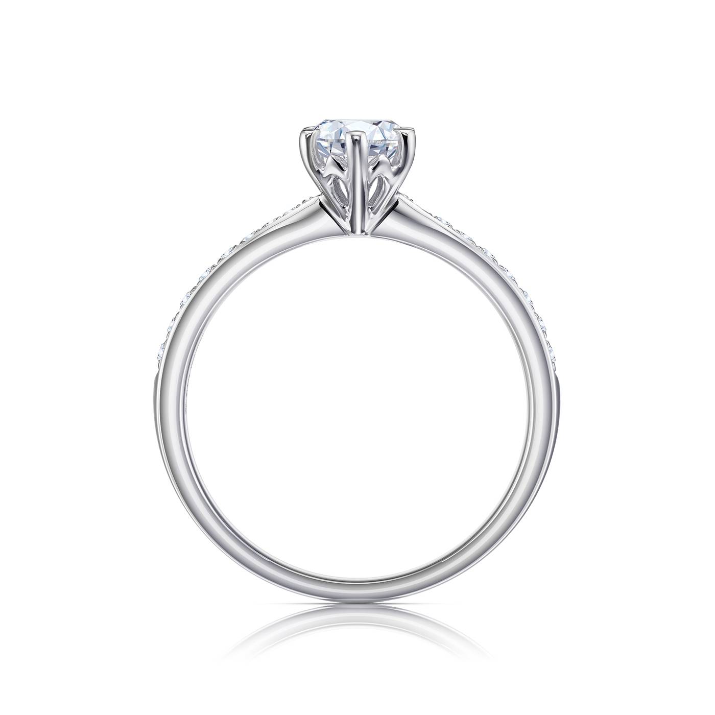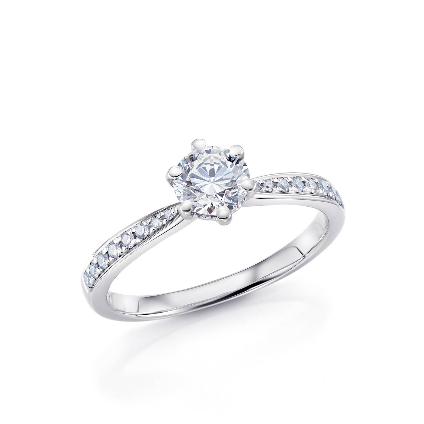 clásico de mujer de oro blanco de 18k con brillantes. Un anillo enriquecido con brillantes pequeños en el brazo acompañado de un diamante central de gran pureza y color, una joya de nuestra colección de anillos de compromiso de oro blanco, en Jorge Juan Joyeros. Una joya imprescindible de mujer.