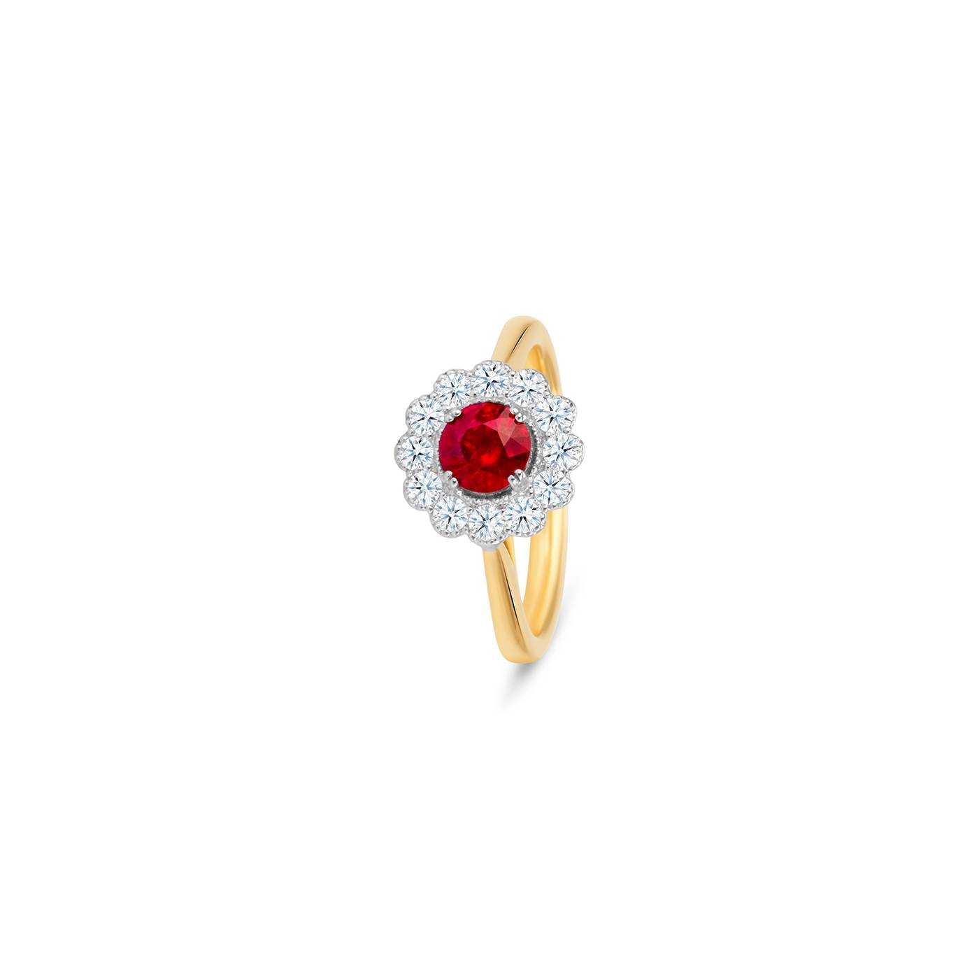 Anillo orla con un rubí redondo de 0,54 cts rodeado de brillantes que aporta luz y brillo