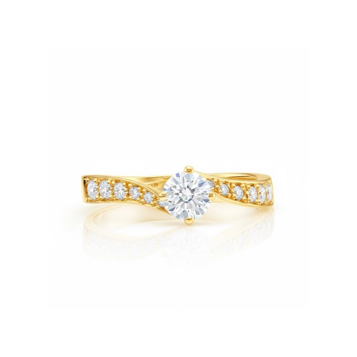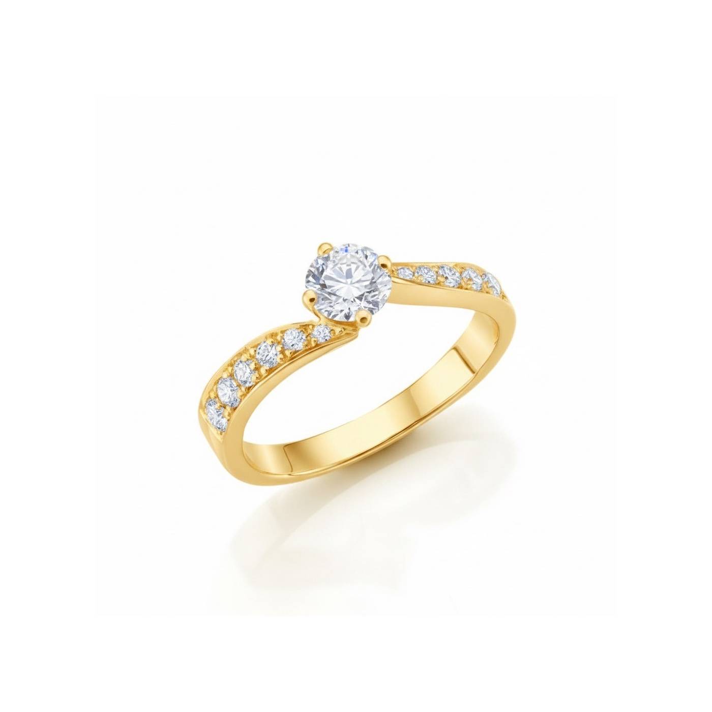Anillo elegante con brillante central, movimiento ondulado del brazo cubierto por hilera de brillantes en disminución. La forma sensual de este anillo que fabricamos tanto en oro blanco como en oro amarillo 18K hace que sea un anillo que no pasa desapercibido. Consulte con nuestro equipo si desea otras calidades de brillante, y si lo desea, aquí puede ver anillos de oro amarillo para hacer el regalo especial. REF: SC 211 OA