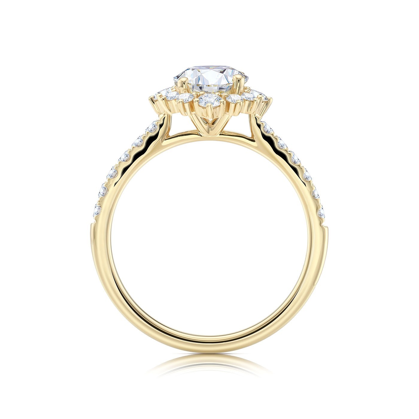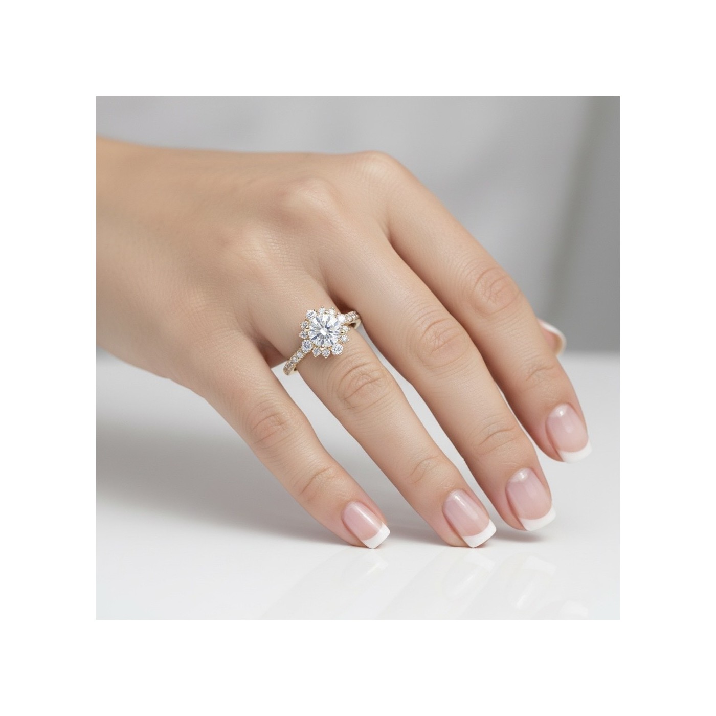 Anillo de oro amarillo con Diamante de 1 quilate. La belleza de este anillo radica en la forma especial de la orla de brillantes que rodean al Diamante central haciendo que luzca de forma espectacular. Una joya perfecta como regalo de aniversario o de compromiso por su carácter atemporal. Utilizamos las mejores calidades de diamante certificado y cuidamos los detalles al máximo.