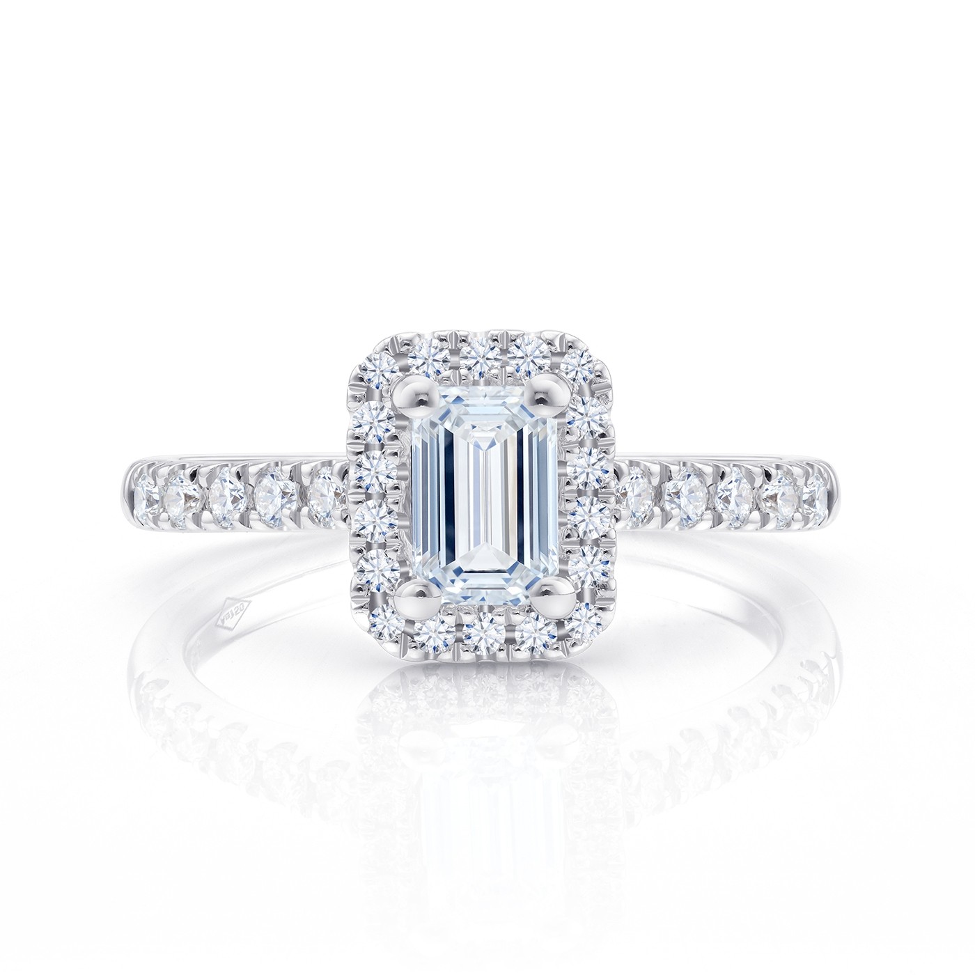 Anillo oro blanco y diamante corte esmeralda "Promise" SR 142. El anillo va rodeado en una orla de brillantes pequeños y brillantes en el brazo. Espectacular anillo de diamantes de oro o para regalar en un aniversario o momento especial. Su diamante de talla esmeralda, al que acompañan diamantes pequeños en el conjunto de la joya, permite disponer de una única y elegante para lucir en momentos especiales. Descubre nuestros anillos en nuestras joyerías en Madrid.