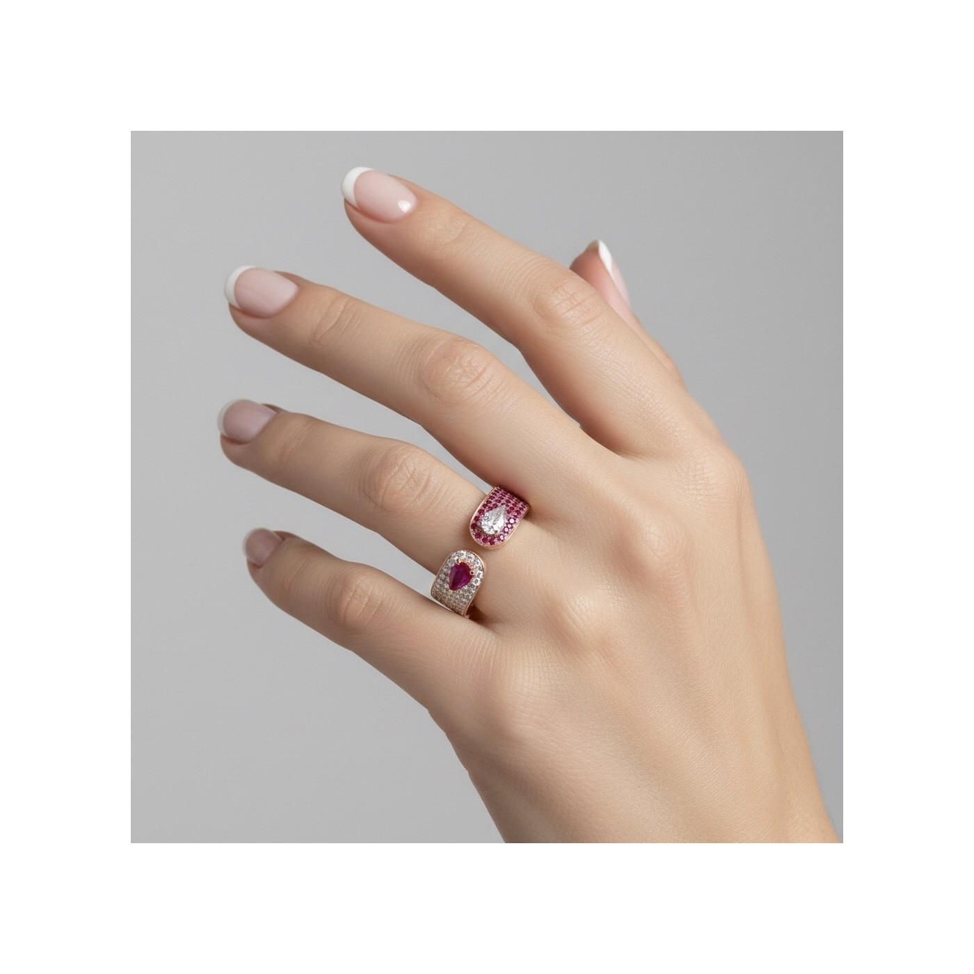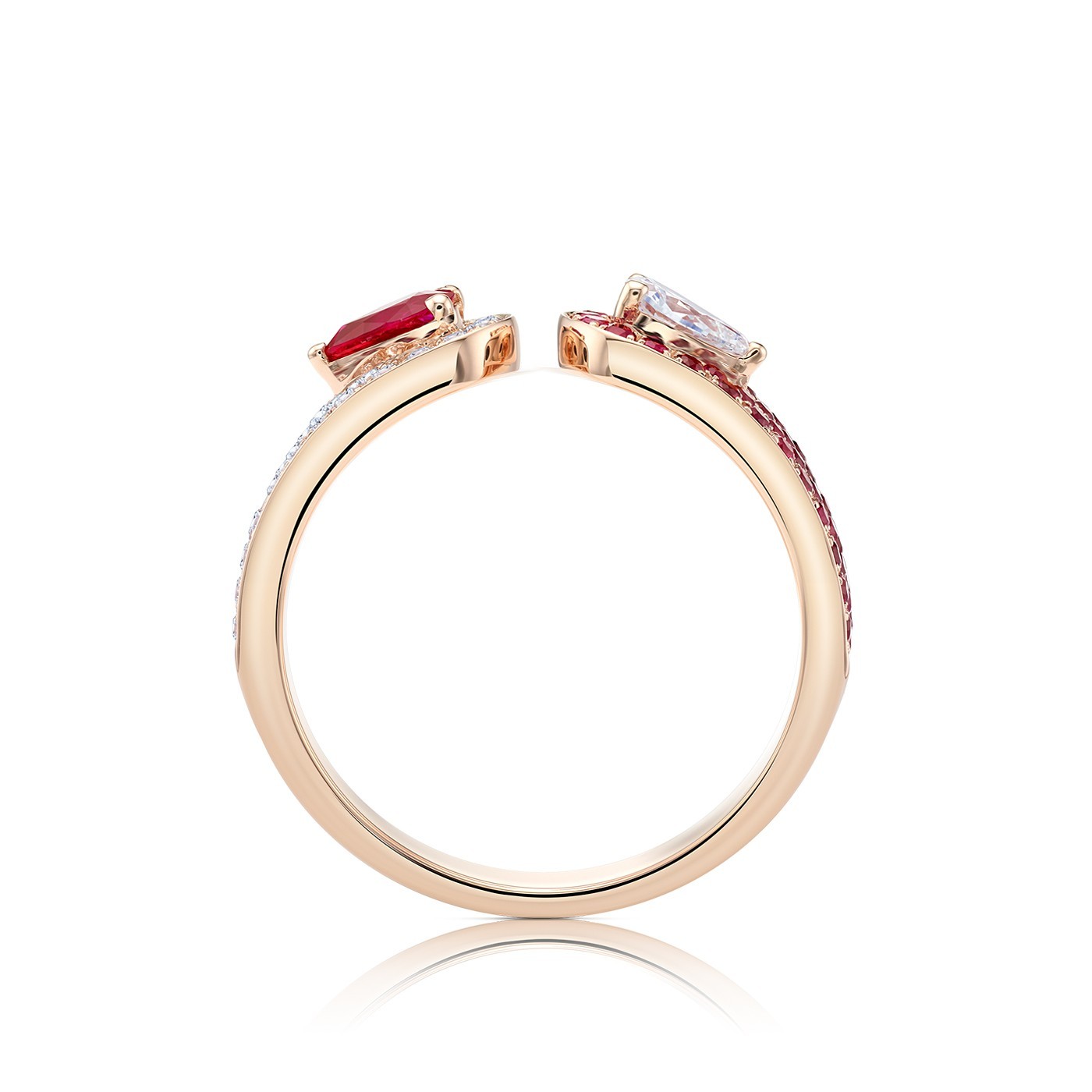 Anillo de estilo Tú y Yo con un Diamante talla Perilla y un Rubí Natural Sangre de Pichón en oro rosa 18k. Una joya original y atrevida acompañada por un doble pavé de brillantes y de rubís. La combinación del rojo con el diamante es magnífica.