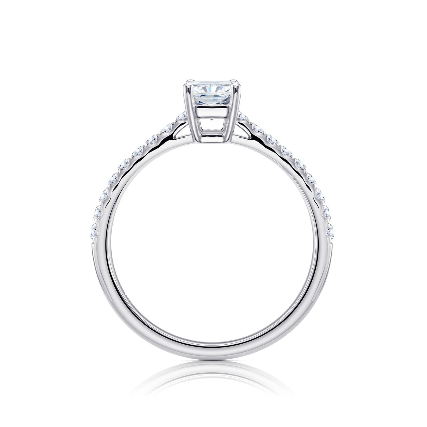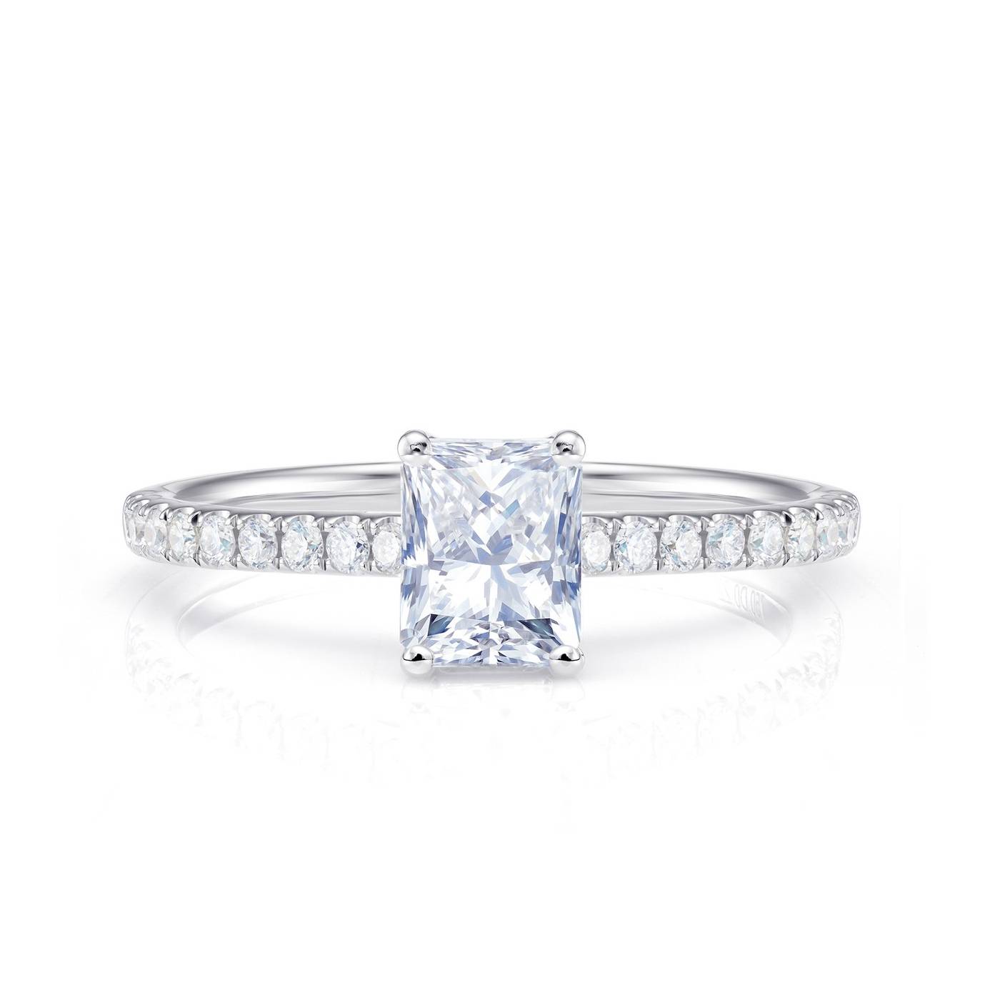 Anillo "Radiant cut" con diamantes en oro blanco 18K ideal como anillo de pedida. La talla Radiant potencia el brillo natural del diamante y es muy original. Los brillantes debrazo son el acompañamiento perfecto. Este anillo de diamante, es mágnífico como anillo de pedida, aquí podrás ver anillos de compromiso para una pedida especial. En Jorge Juan Joyeros somos especialistas en todo tipo de anillos de pedida, siendo además productos con diamantes certifiados por el GIA. SPHK 32