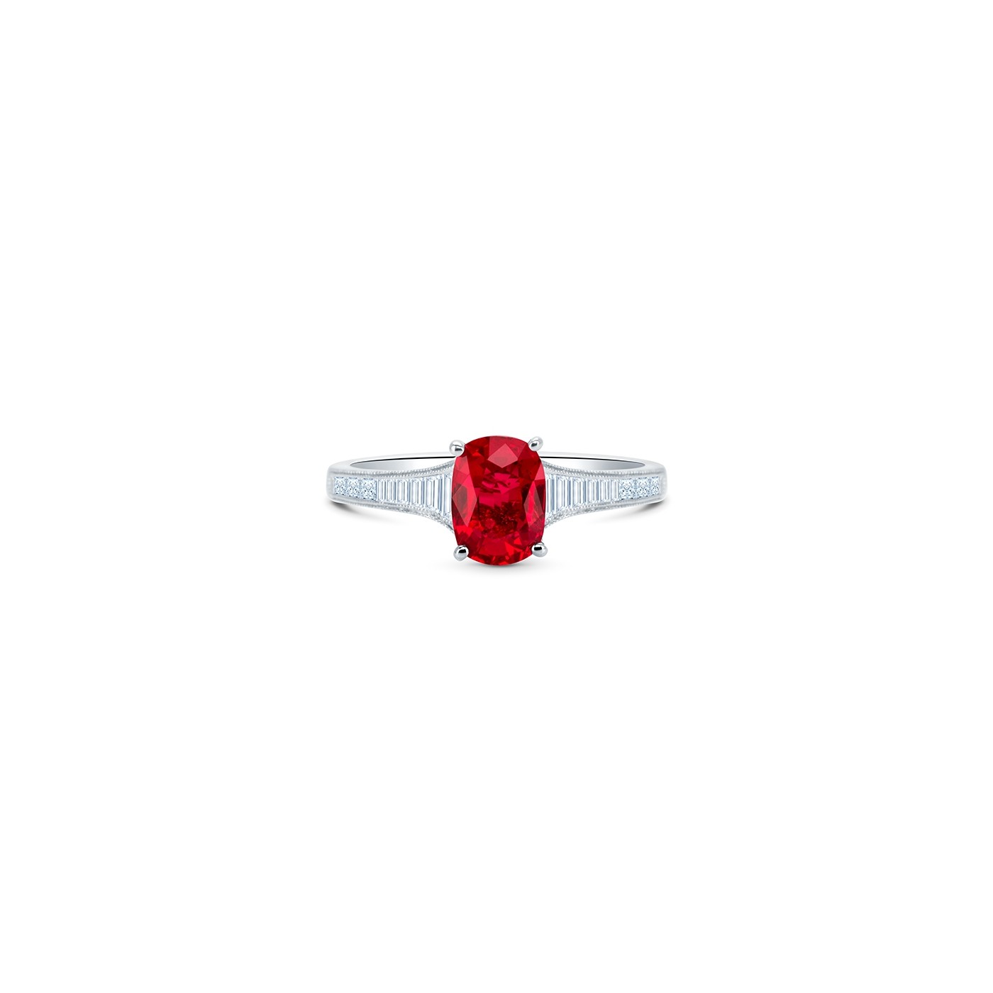 Anillo con Rubí talla oval acompañado por diamantes talla baguette en oro blanco de 18k. Nuestra colección de anillos de rubí siempre se realiza, como en cualquier otra piedra preciosas, con gemas naturales de alta calidad, bien sea para anillo de compromiso de diamante o cualquier otra joya de nuestras colecciones. Por ello todas nuestras gemas se entregan con su correspondiente certificado gemológico. Descubre en Jorge Juan Joyeros dos joyerías únicas en Madrid.