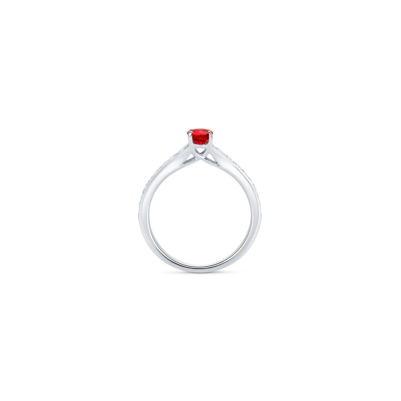 Anillo con Rubí central en talla oval acompañado por diamantes talla brillante en disminución a ambos lados. Anillo de rubi elegante y perfecto para amantes de este color rojo que simboliza el fuego y la pasión. Tofos nuestros diseños de joyas, sean anillos de diamantes o engastados con otras piedras preciosas, se entregan con el correspondiente certificado gemológico.-