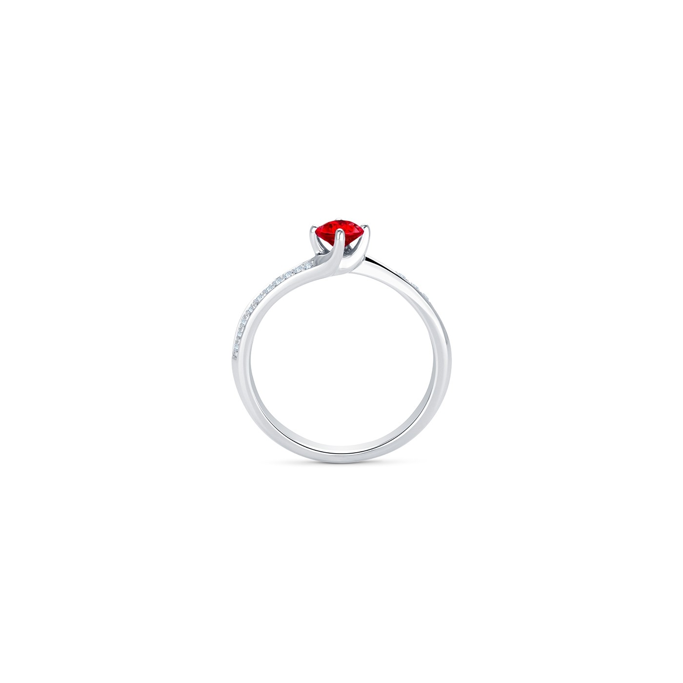 Anillo con Rubí central acompañado por suave línea ondulada de Brillantes en oro blanco de 18K. El diseño sensual de este anillo de rubi realzado por la fuerza del Rubí lo hace perfecto para un regalo especial, nuestros diseños de anillos de diamantes en muchos casos se acompañas de piedras preciosas como son el propio rubi, un zafiro o una esmeralda, lo que permite dar luz al conjunto de la joya.