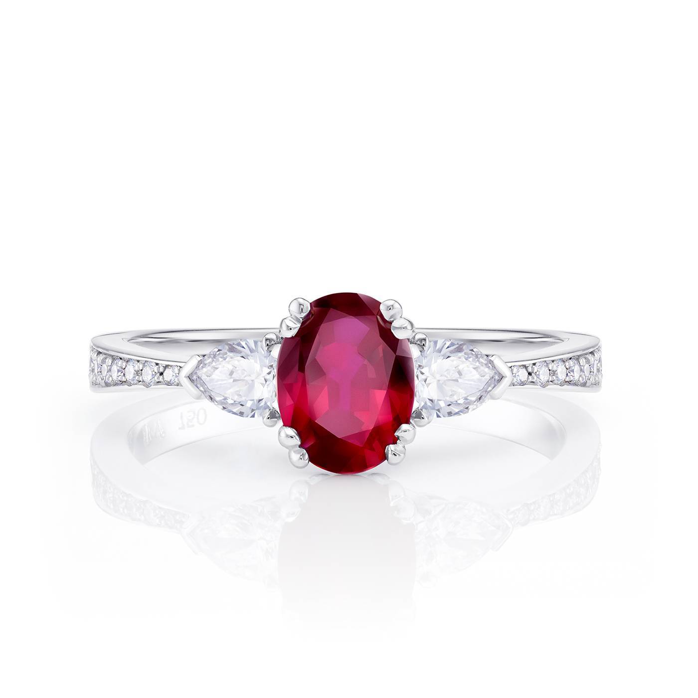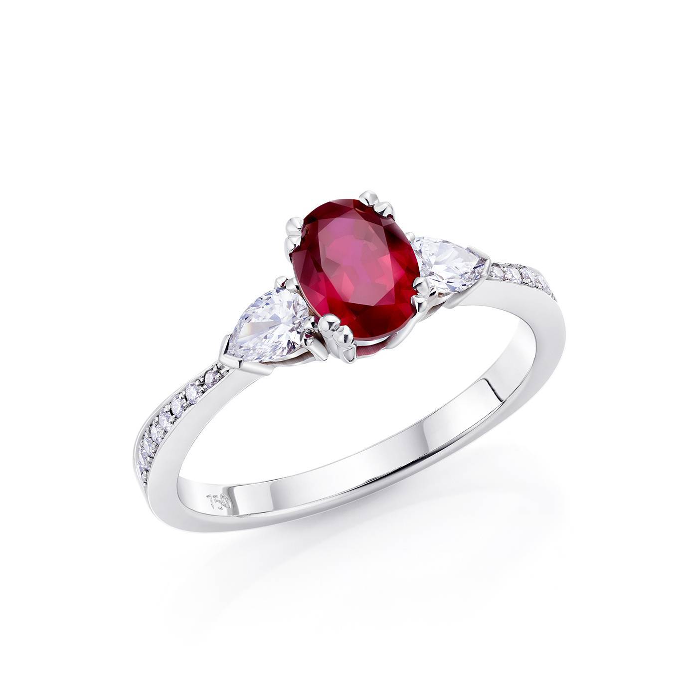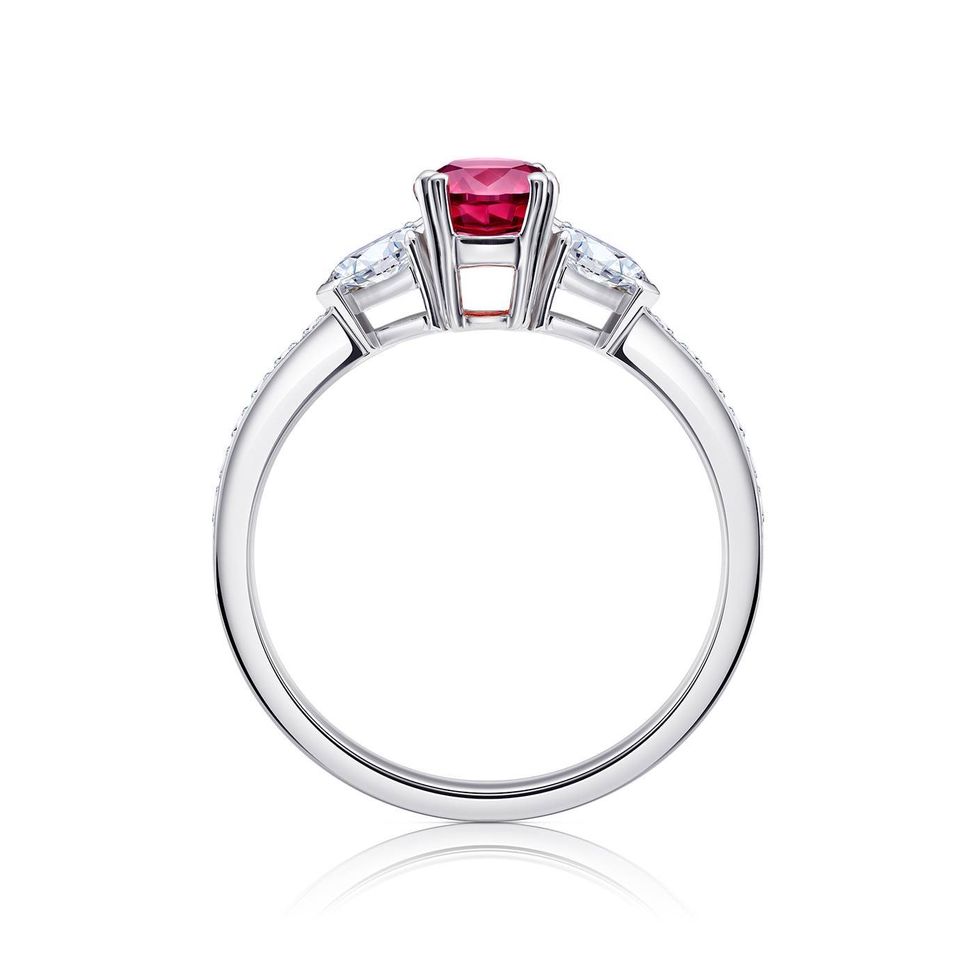 Anillo con Rubí calidad Gem "Sangre de Pichón" acompañado por dos diamantes talla perilla y brillantes en el brazo. El peso total en diamantes es de 0,31 ct. Una joya única por su bello color intenso y diseño actual realizado en oro blanco 18K por Jorge Juan Joyeros en nuestro taller de Madrid. REFERENCIA SMJK 11/2.