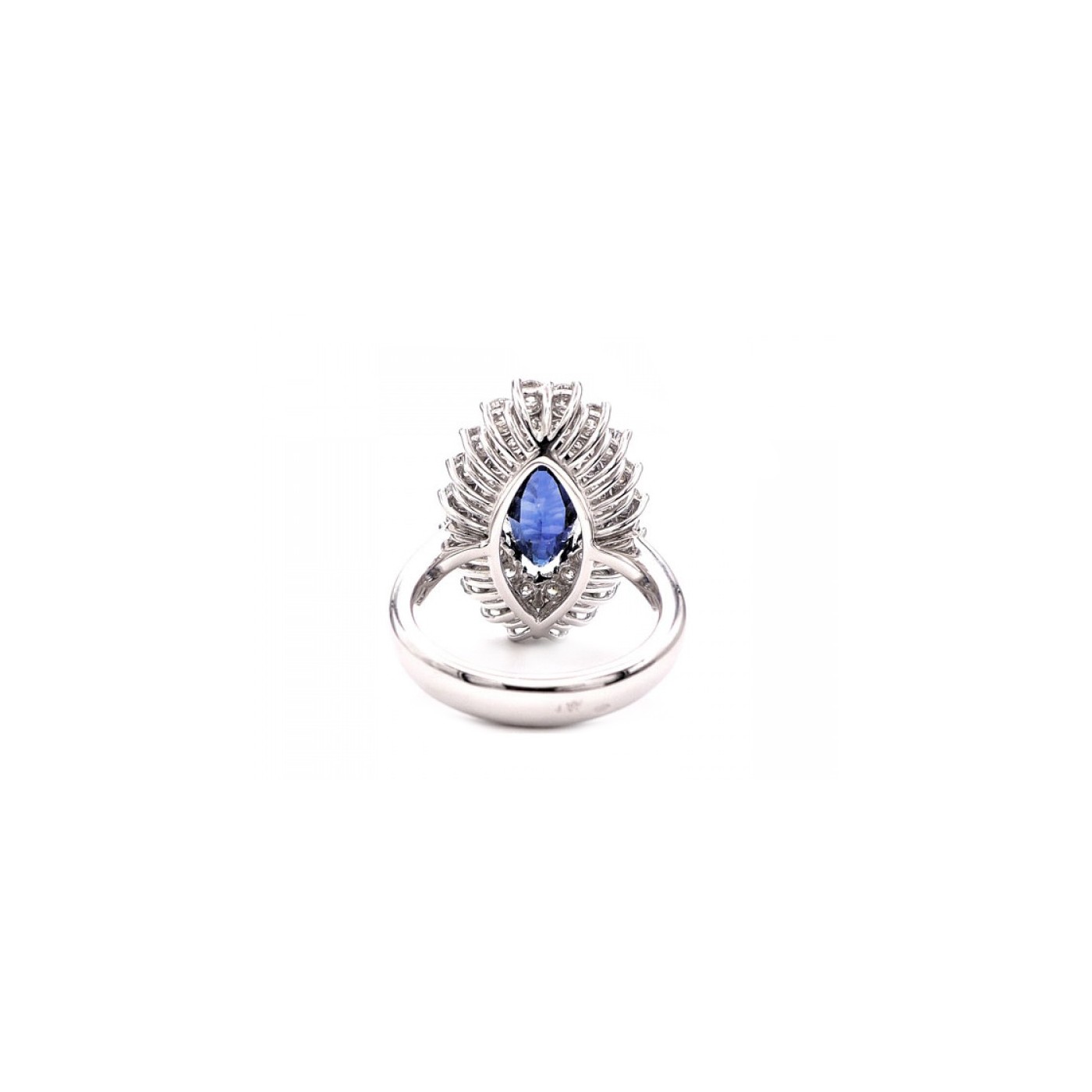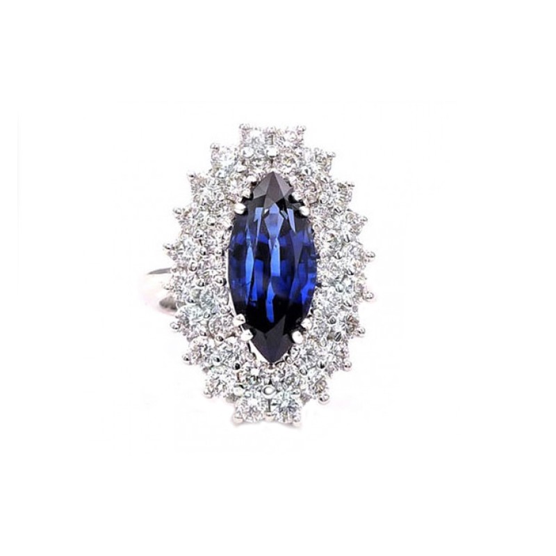 Anillo con Zafiro Azul de talla Marquise rodeado por orla doble de brillantes. Descubre anillos de zafiro con diamantes con formas cuadradas, redondas, rectangulares u ovaladas con los que realizar diseños personalizados. El Zafiro Azul tiene como simbolismo más cercano la serenidad y la calma, cualidades sumamente apreciadas. Anillo espectacular para regalar en ocasiones especiales. Encuentra en nuestras joyerías diseños de anillos de compromiso de zafiro para el sí quiero con extraordinarias calidades.- RF: SI 203