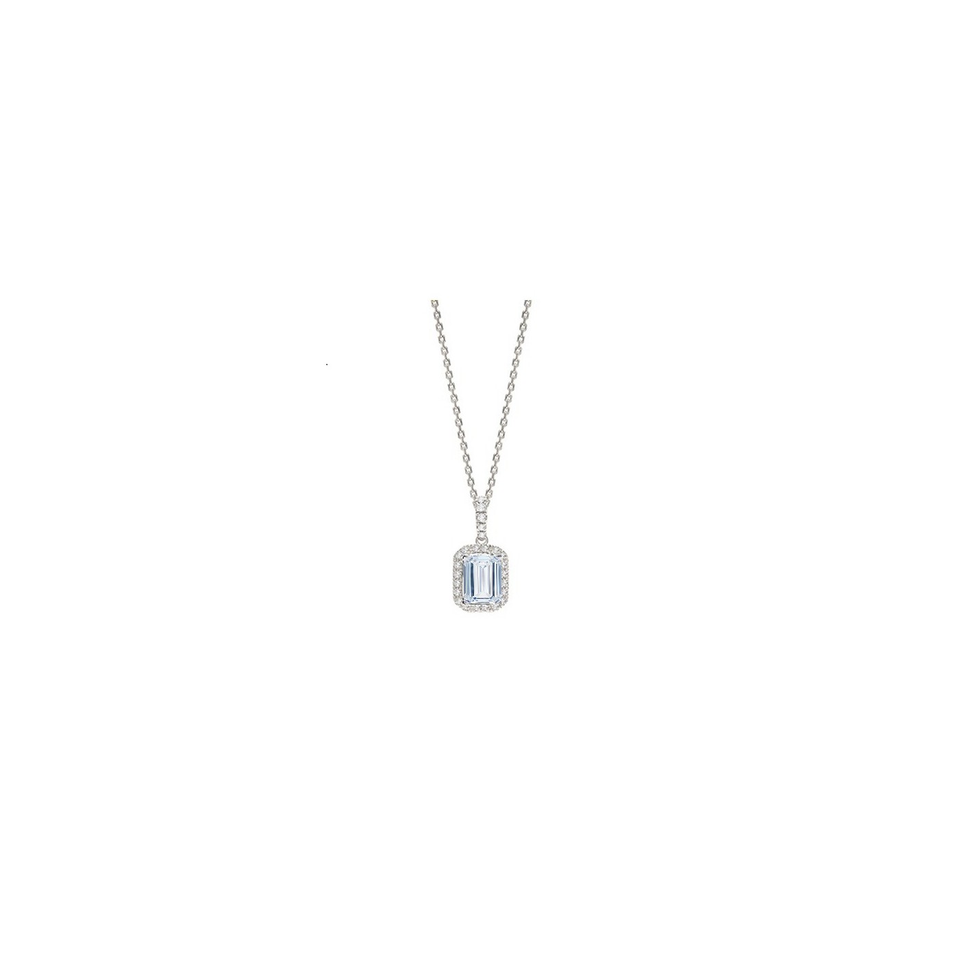 Collar en oro blanco con diamante talla esmeralda rodeado por orla de pequeños brillantes y barrita de oro blanco y brillantes. Incluye cadena de oro blanco. Sencillez para lucir a diario. Ideal para regalo .