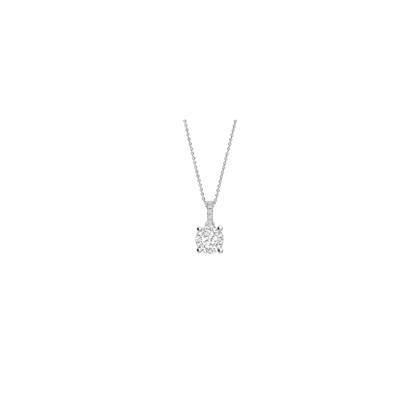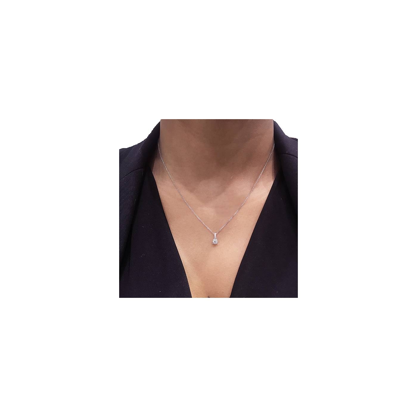 Colgante Oro Blanco de diamante " Lucky" - CR 12 OB. Lleva un Brillante central engastado con cuatro garras y asa de 5 brillantes en cascada. Cadena fina de oro blanco 18K. Precioso Colgante brillantes en oro blanco tipo solitario de corte clásico que aporta luz al conjunto de la joya. Visítanos sin compromiso en Madrid y descubre nuestra colección de colgantes de oro blanco con diamantes.