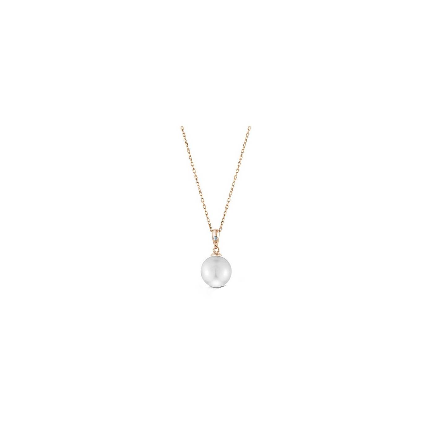 Colgante de oro rosa con Perla redonda y diamante de 0,03 ct con cadena de oro rosa 18K. Colgante de perla y diamante de diseño juvenil para todos los días. Perla australiana redonda de 10 mm aproximadamente con excelente oriente.