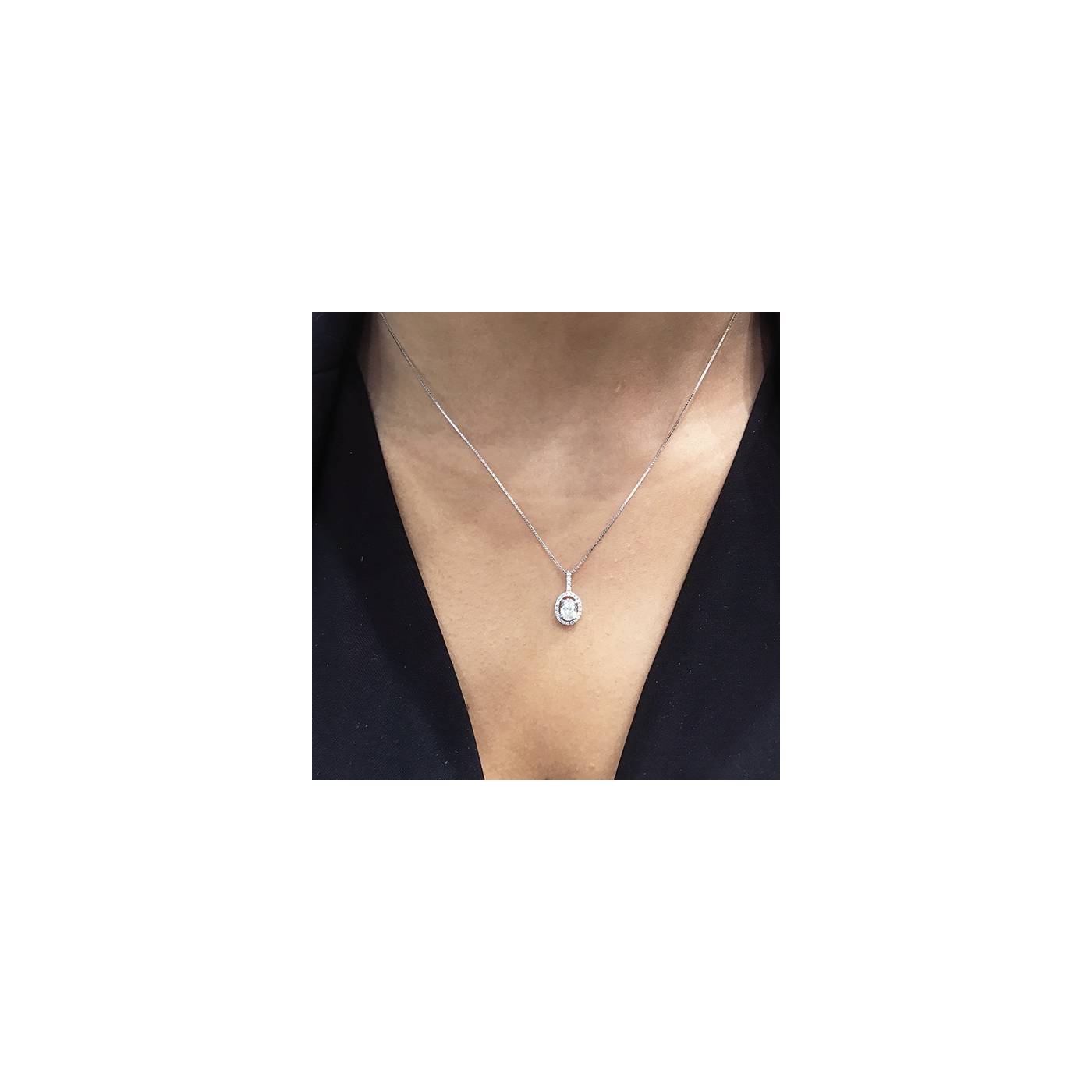 Colgante ovalado con Diamante central talla oval rodeado por orla de brillantes pequeños y asa de brillantes en oro blanco 18k Lady. El peso de los brillantes pequeños es de 0.13 quilates. Cadena de oro blanco. Exclusivo colgante, perfecto para aniversario.