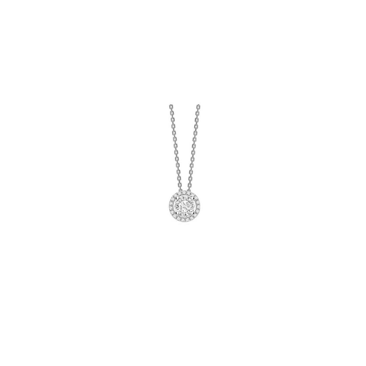Colgante con Diamante engastado con 4 garras Sun, rodeado por una fina orla de brillantes pequeños en oro blanco de 18K. Elegante colgante con cadena fina de oro blanco 18k. Un complemento clásico para lucir a diario. CR 5 OB