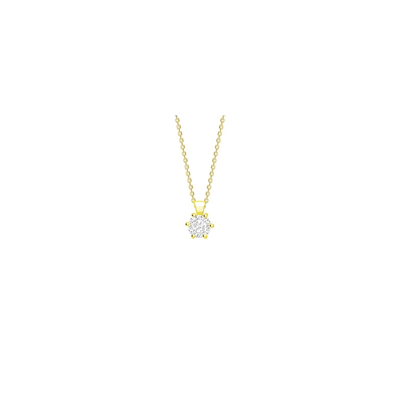 Collar en oro amarillo de 18K con Diamante engastado con 6 garras sencillas Hana. Colgante clásico y sencillo como regalo aniversario. Se fabrica en varios tamaños. Va acompañado por una cadena fina de oro amarillo 18K de 42 cm.