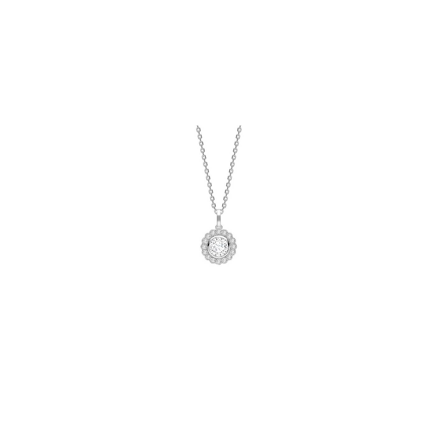 Collar con forma de rosetón con Brillantes en oro blanco 18k Osaka. Collar con brillante central rodeado por orla de brillantes enriquecida por delicada filigrana. Collar perfecto para la Novia.