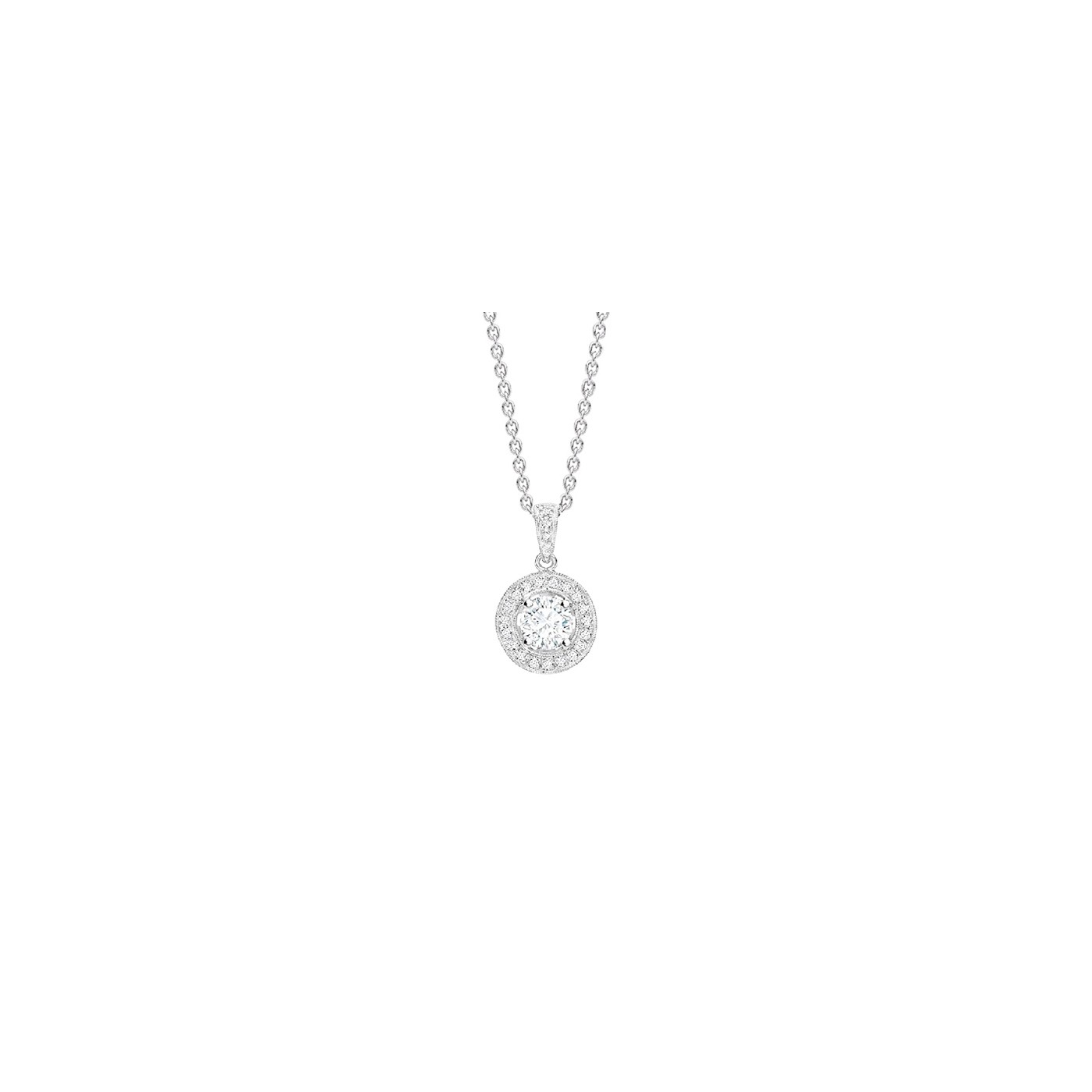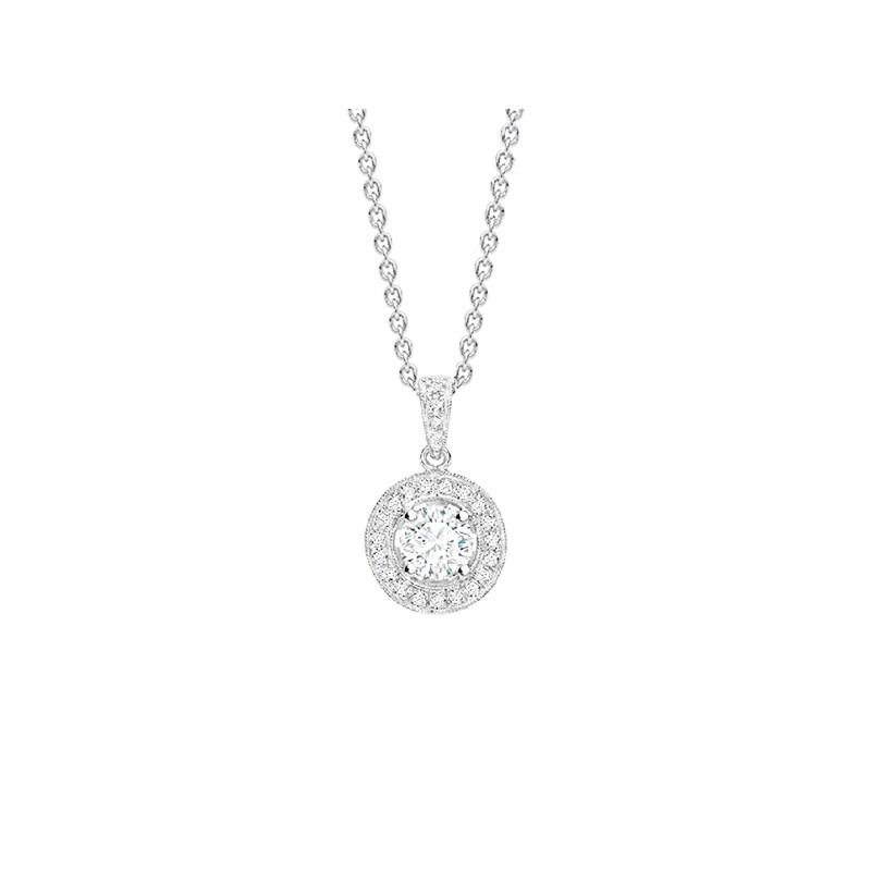 Gargantilla en oro blanco 18k con brillantes "Suntory". Lleva un brillante central rodeado por una orla de brillantes y asa con brillantes pequeños. Elegante y clásico colgante para lucir en cualquier ocasión. Incluye la cadena de oro blanco 18k.