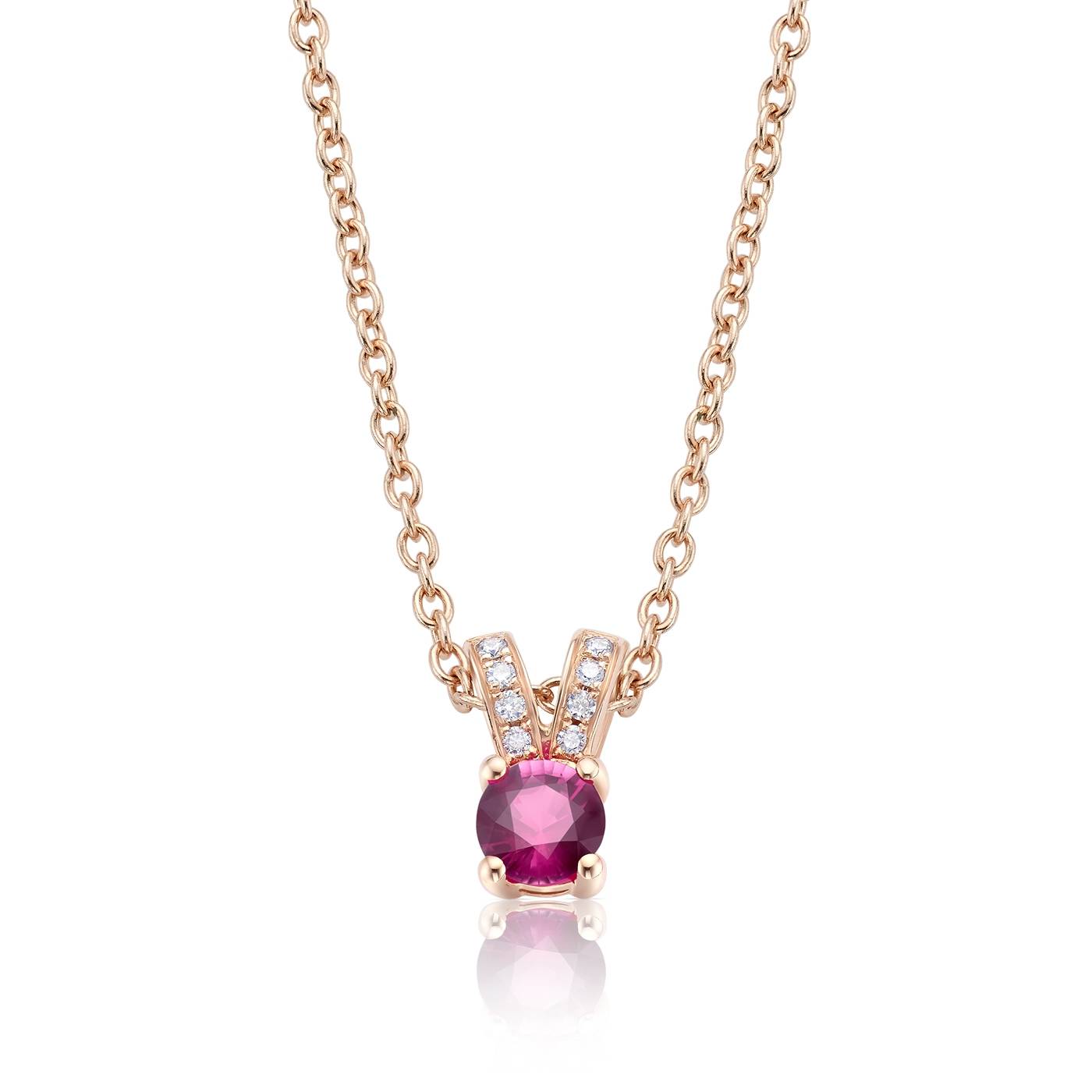 Pendentif "Red Eiffel" Rubí y brillantes, calidad AAA o GEM. Sencillo diseño en oro rosa 18K con la cadena de oro rosa. La calidez del rubí aporta belleza al escote. Con certificado gemológico.