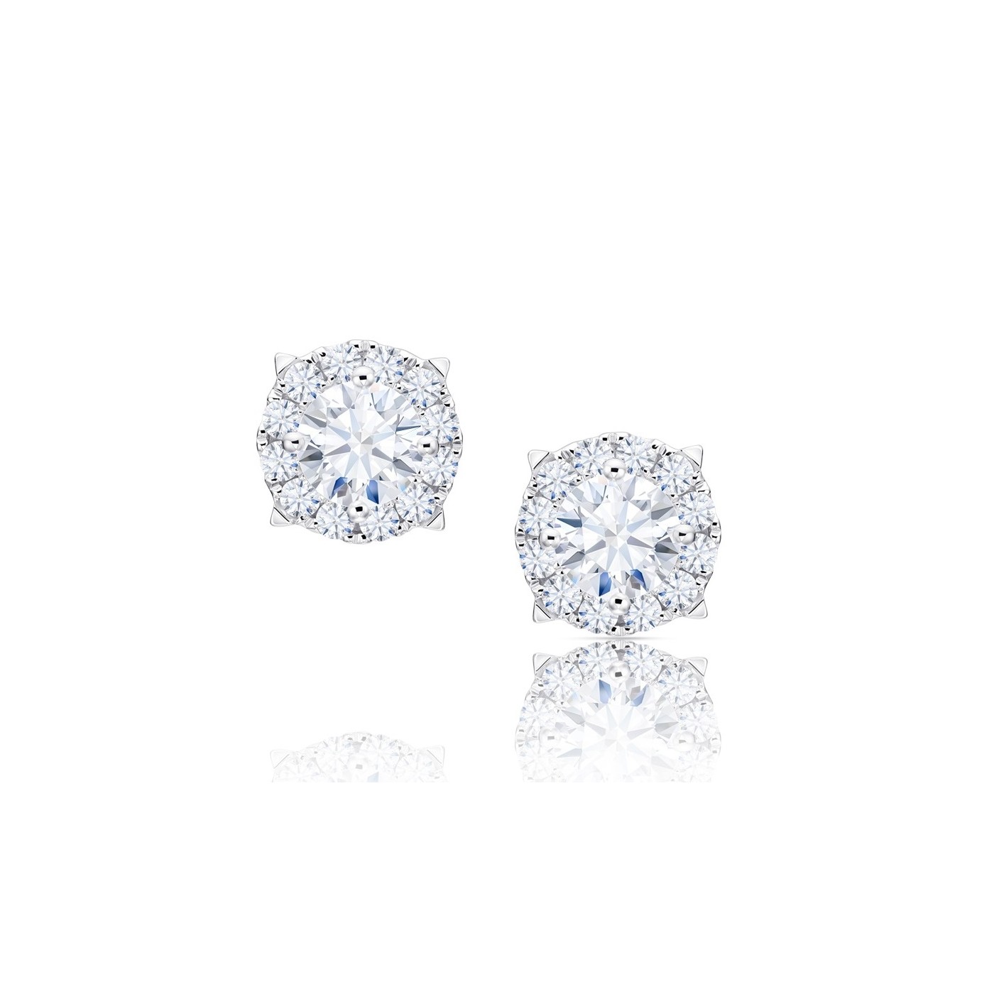 Pendientes con Brillantes y orla especial de brillantes. El brillante central va engastado mediante cuatro garras rodeado por una orla de brillantes pequeños en oro blanco de 18K. Consulte disponibilidad de tamaños.
