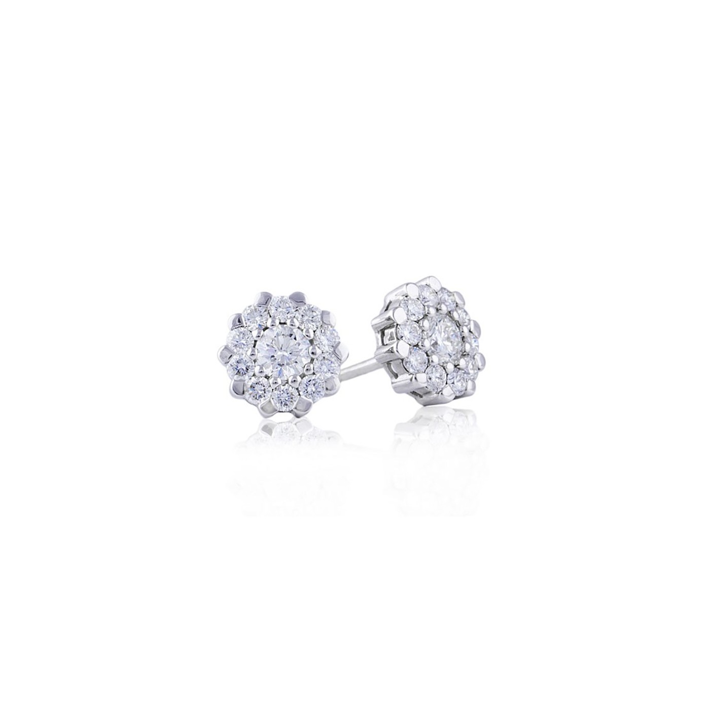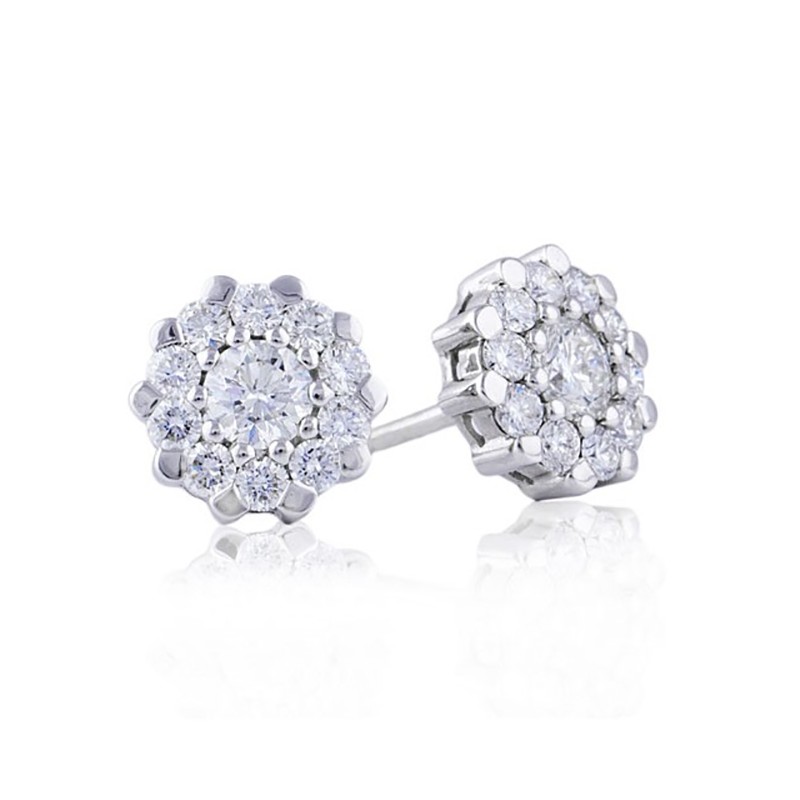 Pendientes de diamantes con orla ideales para novia o para momentos especiales en oro blanco de 18k . El Brillante central está rodeado por brillantes pequeños quedando engastados en el mismo plano y formando la ilusión de tratarse de un sólo diamante. Ideales como pendientes de diamantes para el día de la boda o para lucir en momentos especiales así como en el día a día.