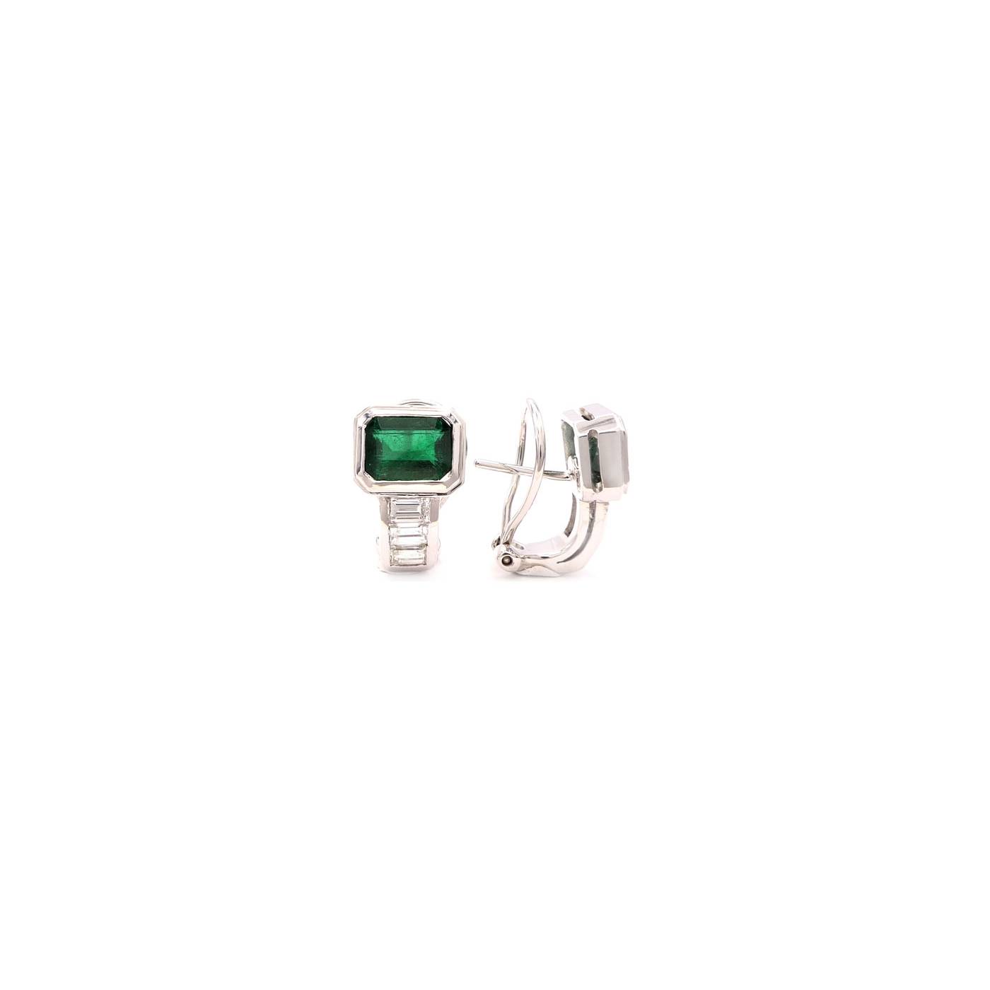 Elegantes pendientes con esmeraldas colombianas en talla octogonal y bonito color y diamantes de talla baguette. El peso total de las esmeraldas es de 3,34 ct y el de los diamantes 0,91 ct. Esmeraldas de gran calidad. Pendientes para ocasiones especiales para amantes del color de la Esperanza y la Salud.