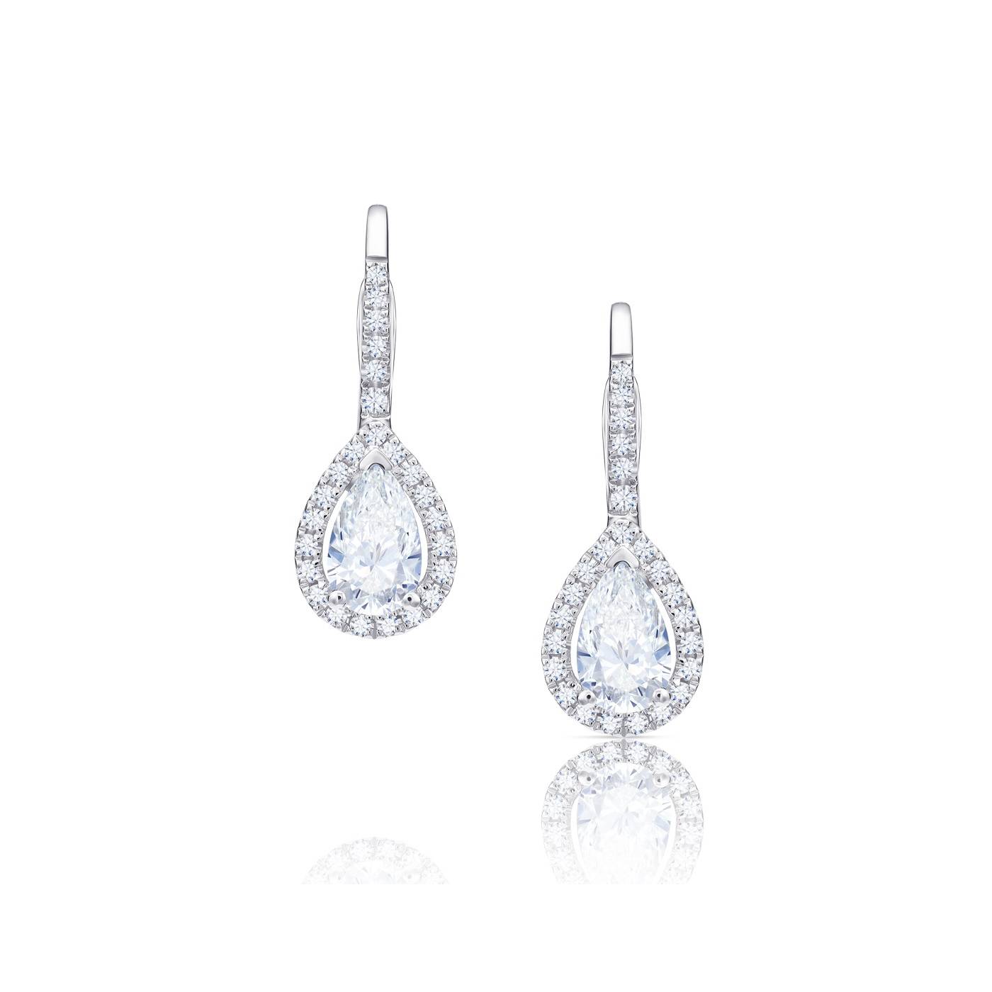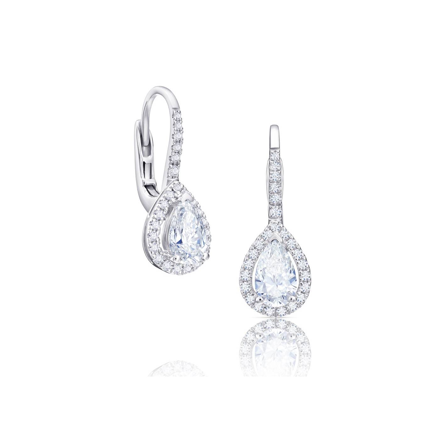 Pendientes largos con Diamante talla Perilla rodeados por fina orla de brillantes y aro de brillantes en oro blanco 18k. Elegantes y originales pendientes por la forma alargada de la talla Perilla. Suave movimiento. Consulte tamaños disponibles. REFERENCIA: PR 18