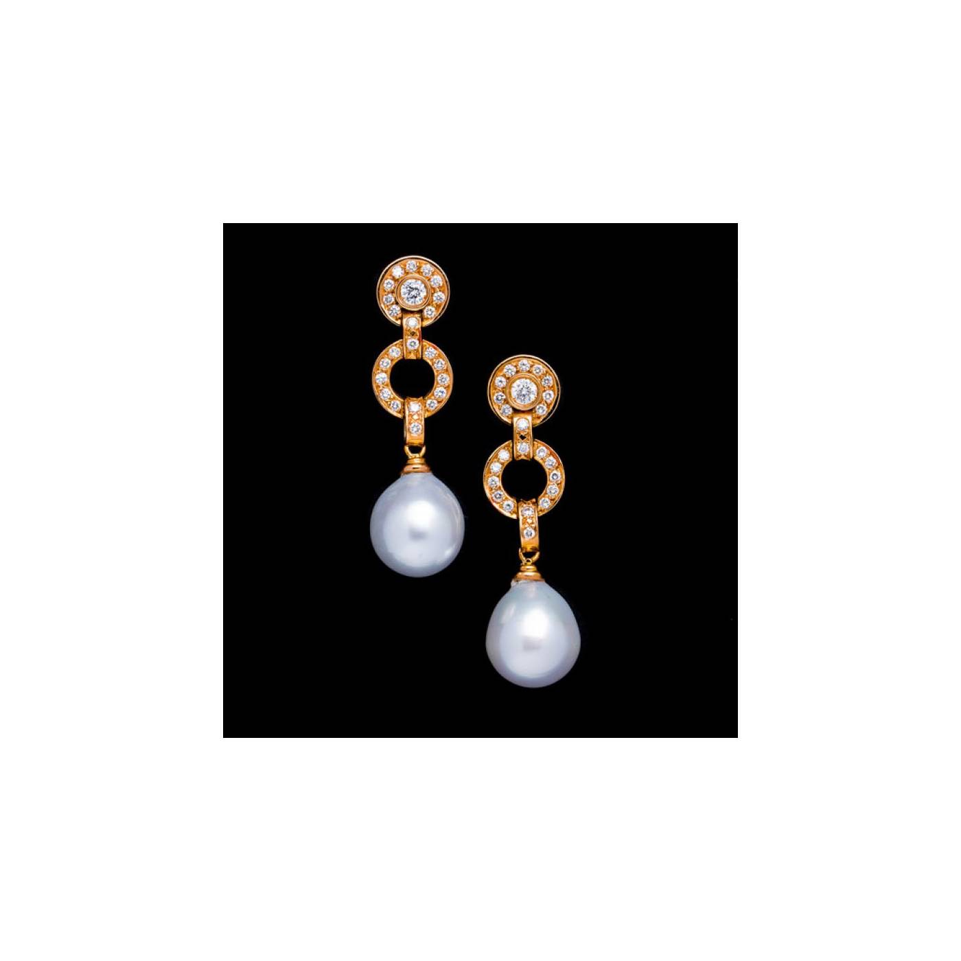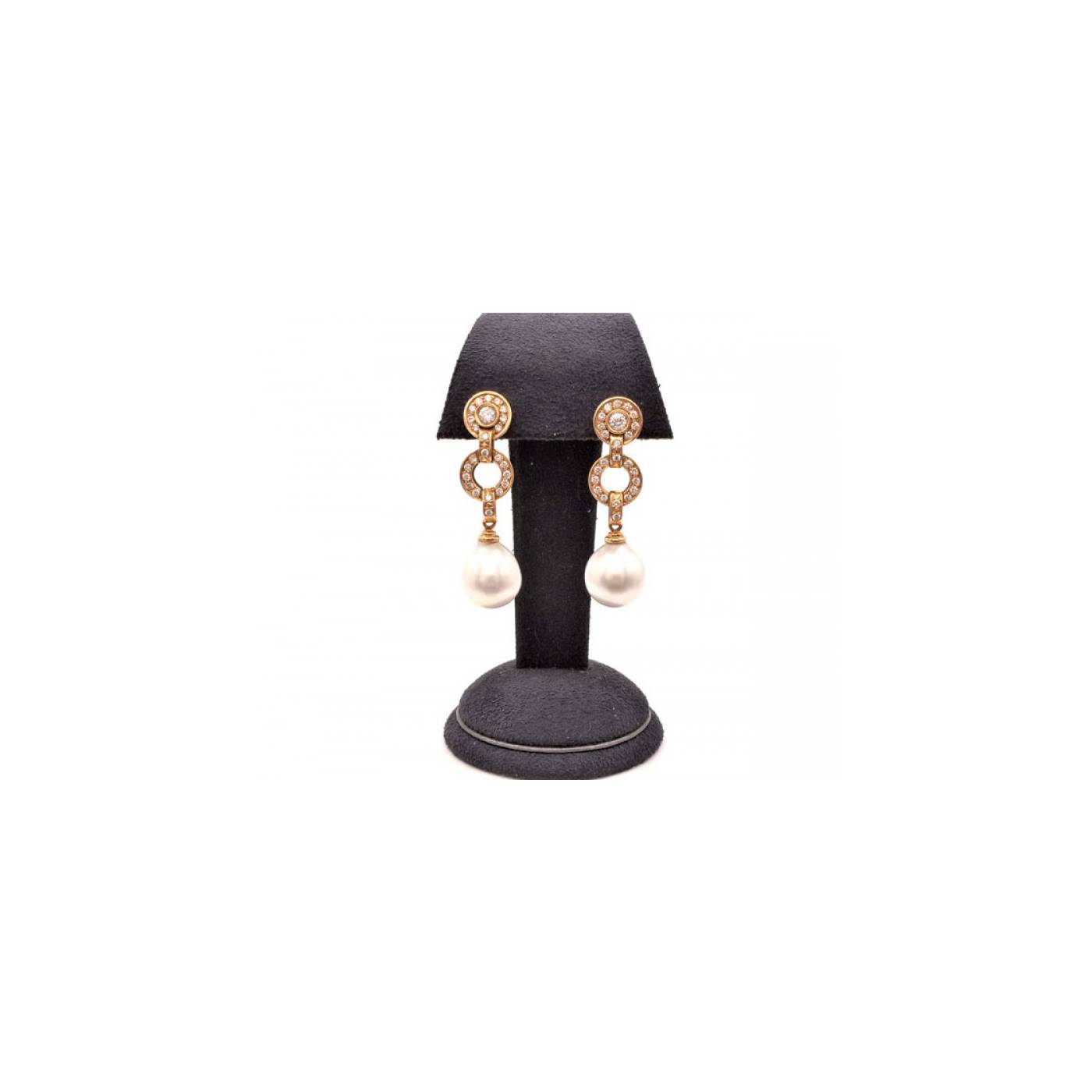 Pendientes largos en oro rosa de 18k con Brillantes y Perlas australianas aperilladas de 12 mm aprox . El peso total en brillantes es 0,92 ct. Pendientes para novia o para ocasiones especiales. La calidez del oro rosa se combina perfectamente con el oriente de las perlas. icono de elegancia.