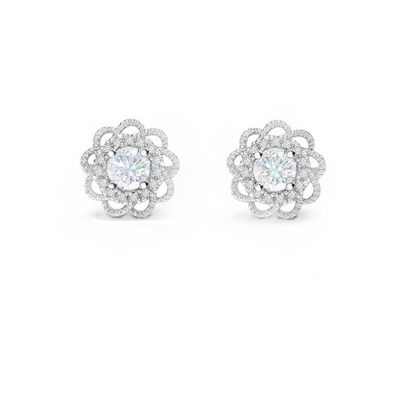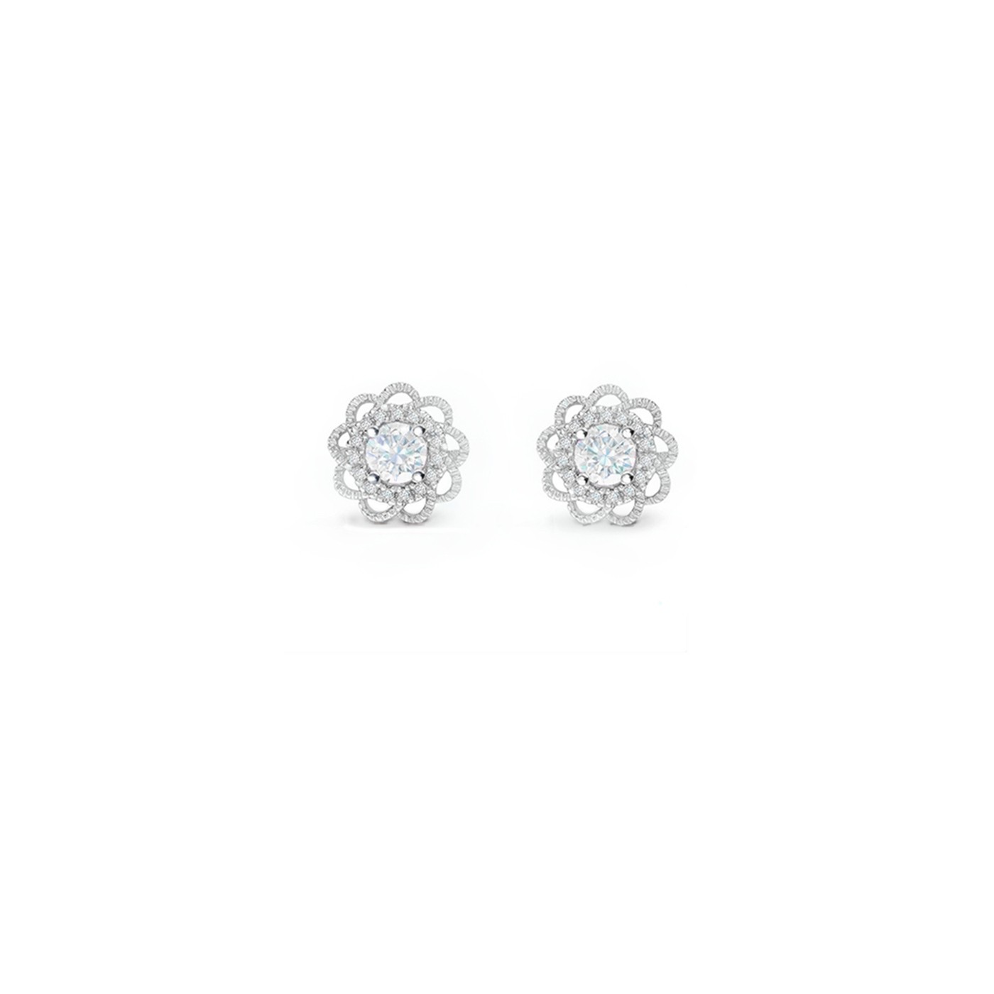 Pendientes con Brillantes de Novia en forma de flor centrales rodeados por una pequeña orla de brillantes y una filigrana labrada en oro blanco. Ideales para lucir en ocasiones especiales manteniendo la discreción.