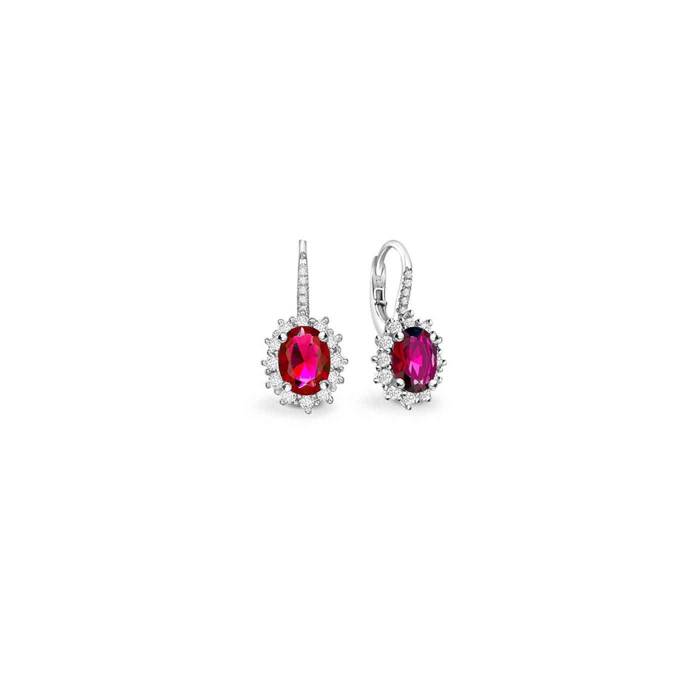 Pendientes con Rubí natural talla oval rodeado por orla de brillantes en garra en oro blanco 18K. Elegante y llamativo pendiente por el color rojo fuego de los Rubís y suave movimiento pendular.
