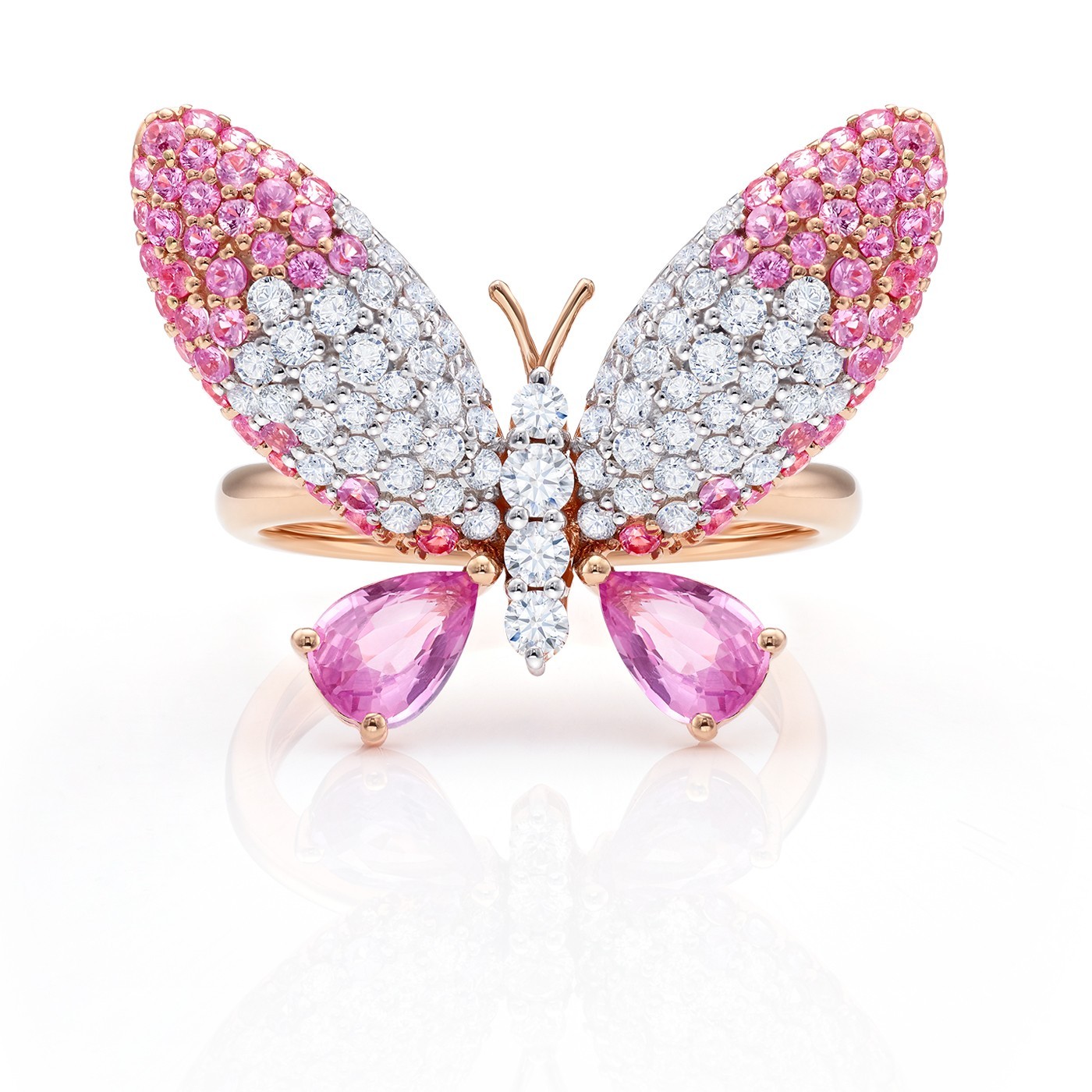 "Pink Farfalle" Zafiros rosas y Brillantes. Anillo con forma de mariposa realizada en oro rosa 18K con Zafiros rosas y brillantes. Una joya especial para aniversario realizada por Jorge Juan Joyeros.
