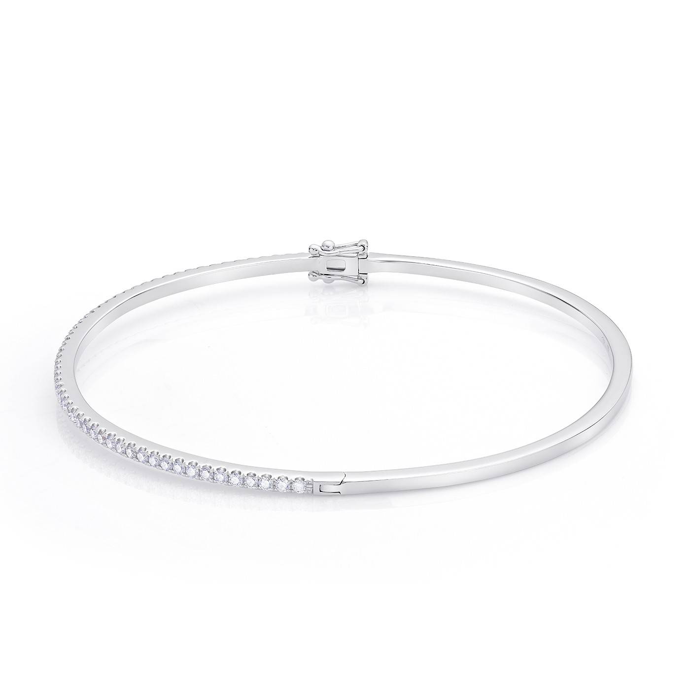 Elegante pulsera rígida estilo brazalete clásico, elaborada en oro blanco de 18k y sutilmente engastada con brillantes en la mitad de su contorno. Por su diseño fino y minimalista, es una joya perfecta tanto para el día a día como para un regalo inolvidable.
