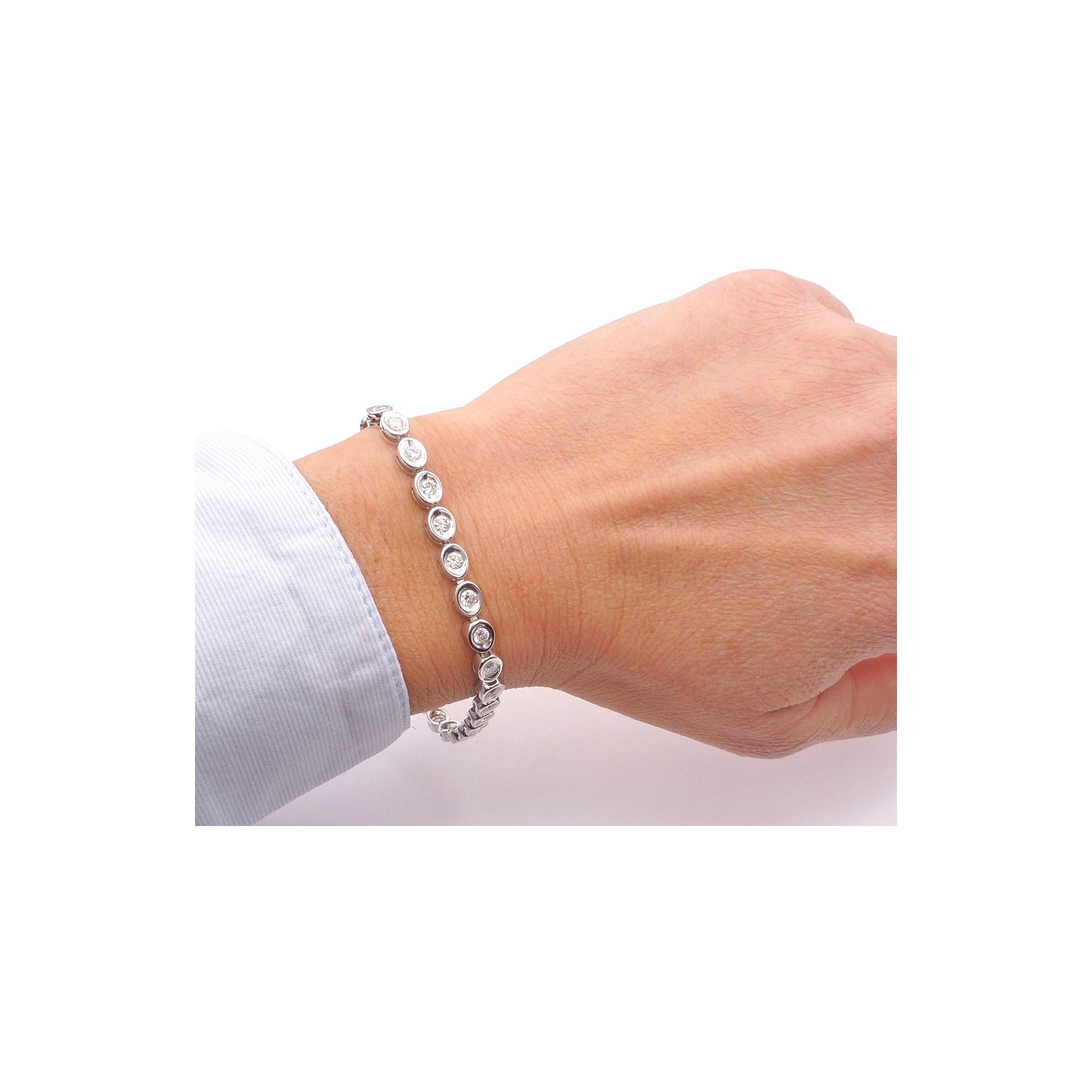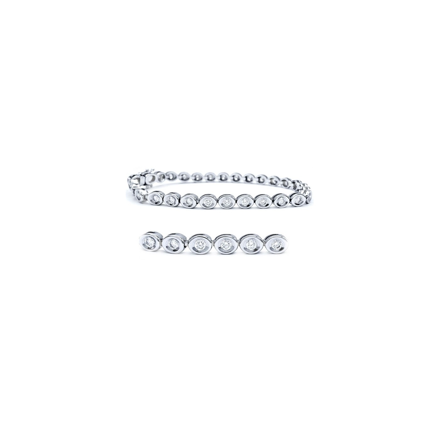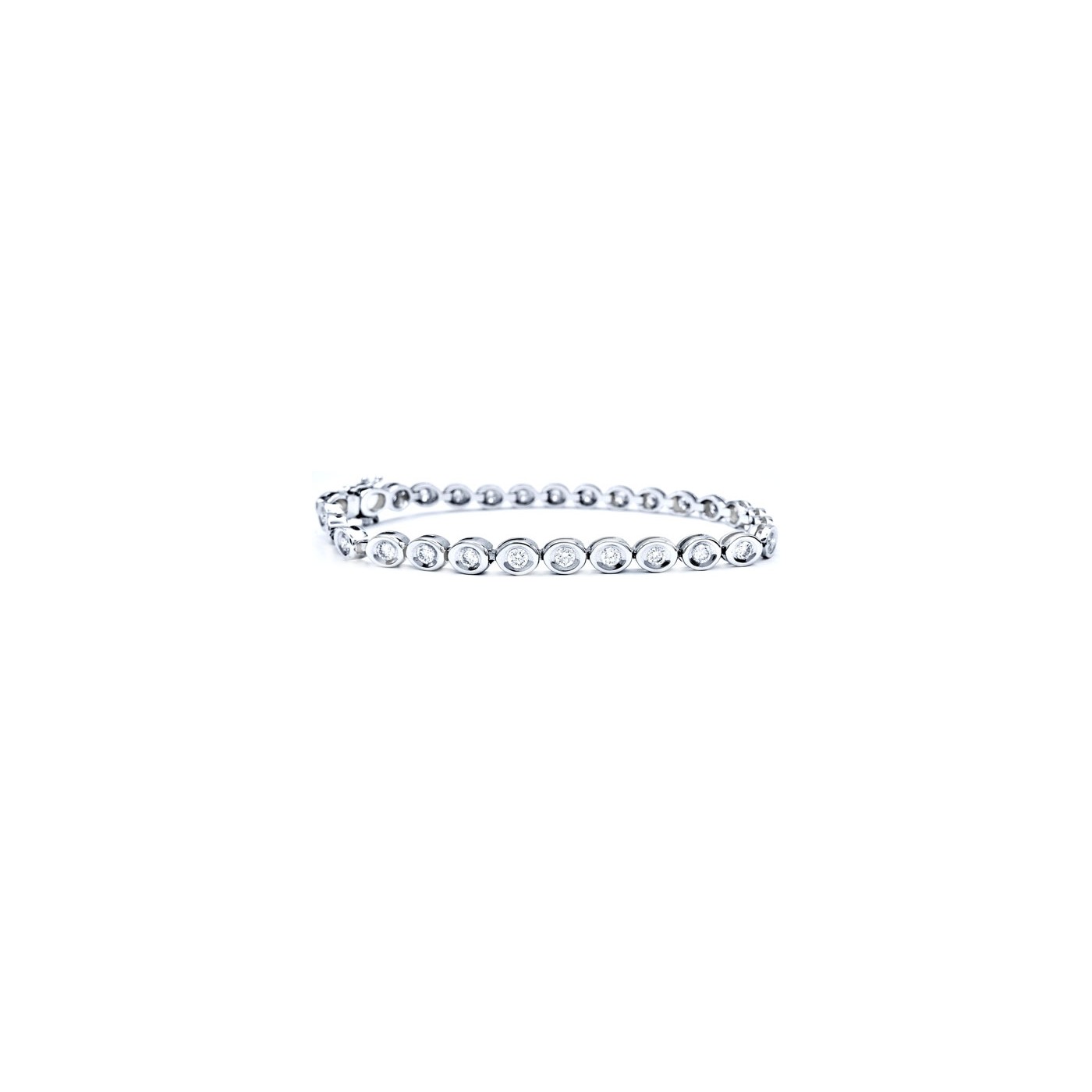Pulsera rivere oro blanco y brillantes "Mediterráneo" con 2.66 cts. de diamantes certificados engastados en chatones de forma ovalada en oro blanco de 18k . Nuestras pulseras de oro y diamantes son ideales para momentos tan especiales como la pedida de mano, un aniversario o un momento muy especial. Ideal para regalar en la pedida de mano o aniversario. Jorge Juan Joyeros, Madrid. REF: RI 23