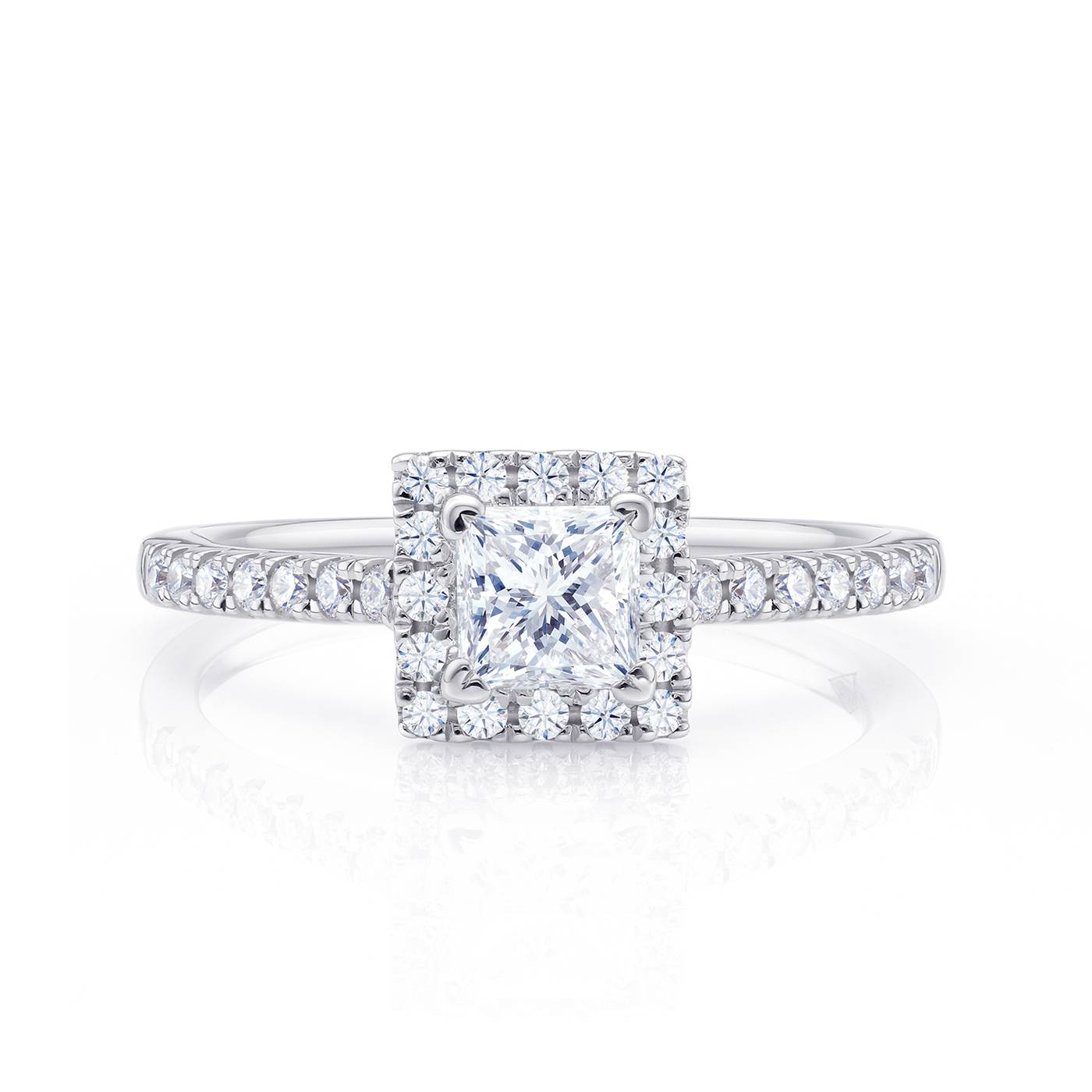 Sortija "Brickell" con Princesa y orla y de diamantes en oro blanco 18K. La belleza de este anillo radica en la forma cuadrada del diamante central rodeado por una orla de brillantes con esa misma forma. Un anillo moderno para la novia actual. La oportunidad de ver anillos de compromiso de Jorge Juan Joyeros es un regalo para los ojos. Se fabrica con diferentes tamaños de diamante en las mejores calidades y siempre con certificado gemológico GIA (Insntituto Gemológico Americano). Ref: SR 103