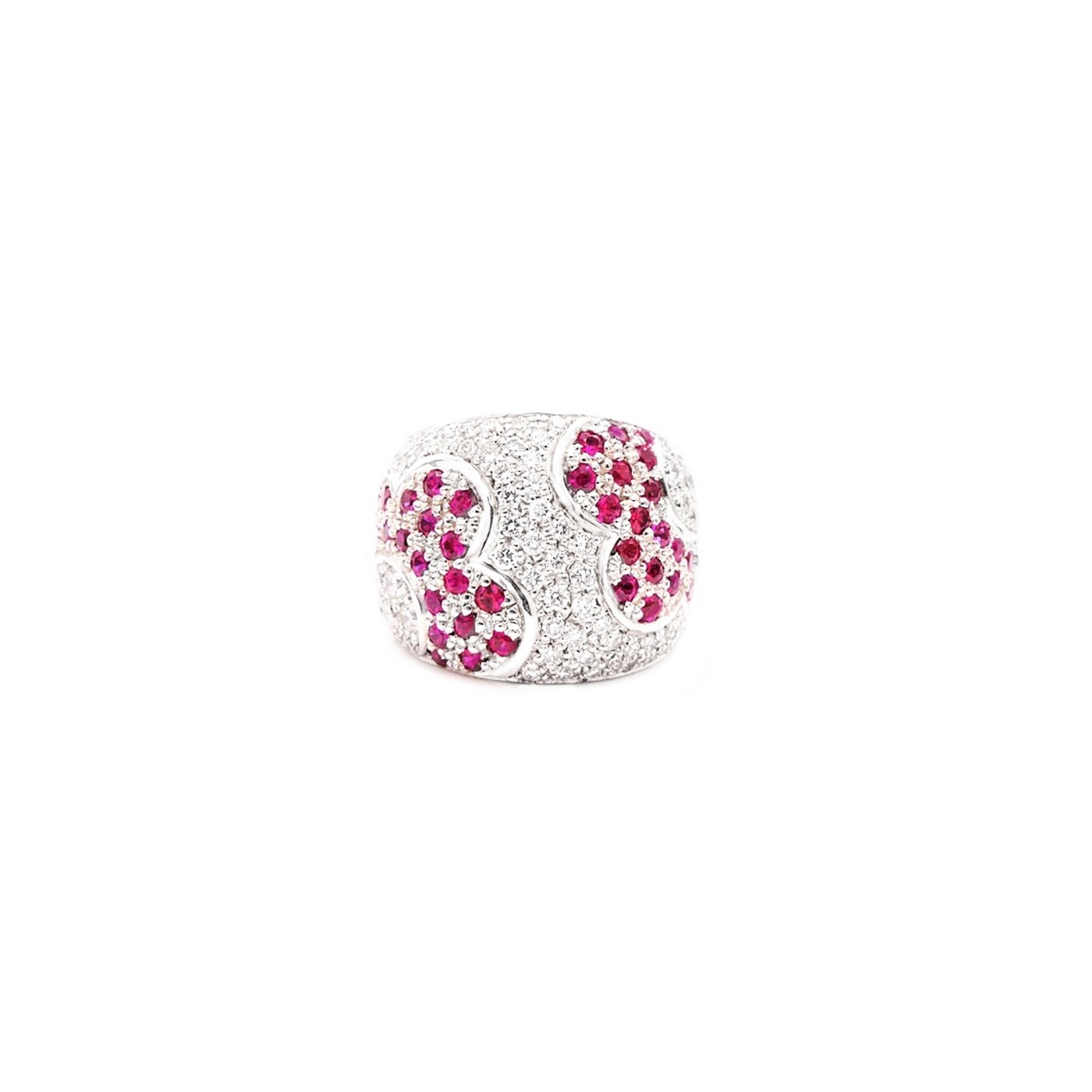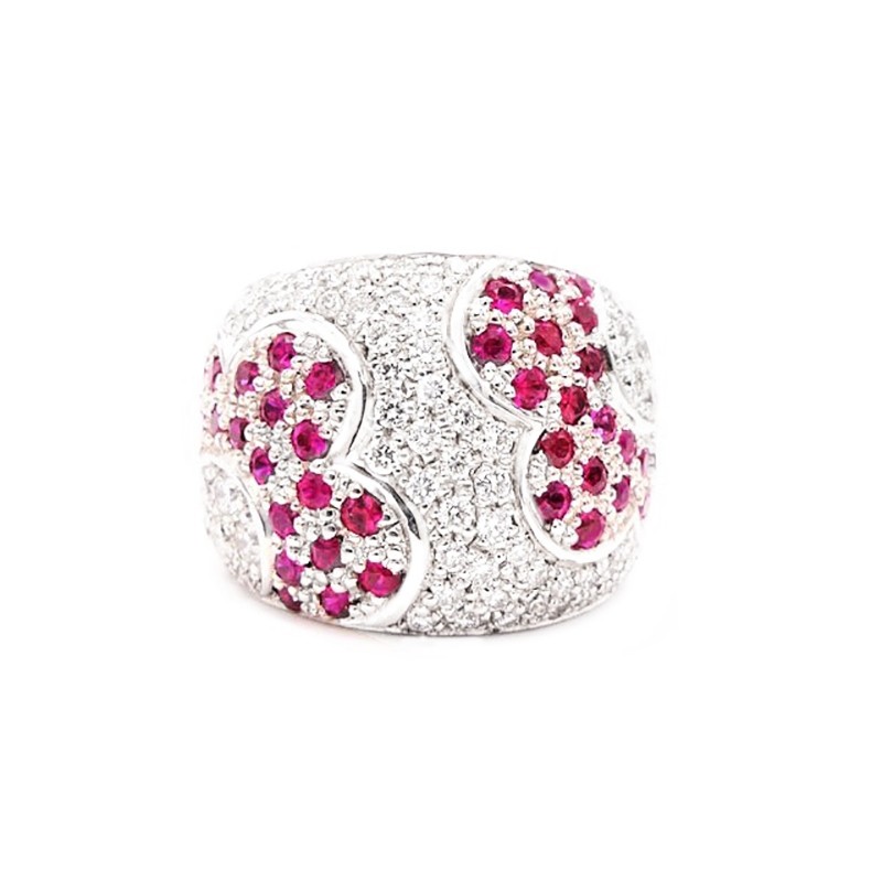Sortija con Rubís y brillantes en pavé con forma de flor japonesa. Sortija realizada en oro blanco. El Rubí simboliza el fuego y la pasión. Sortija ideal para aniversario. REF SI 90